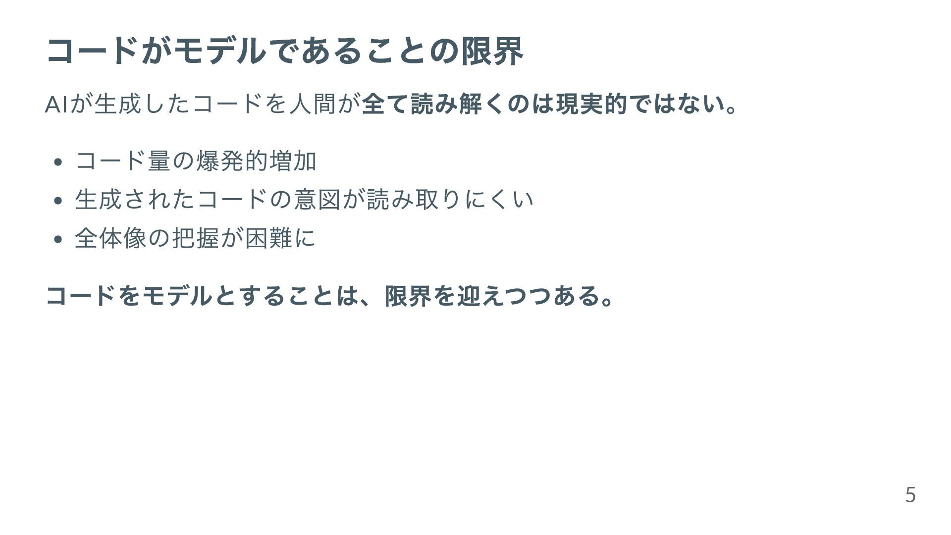 コードがモデルであることの限界 AI が生成したコードを人間が全て読み解くのは現実的ではない。 コード量の爆発的増加 生成されたコードの意図が読み取りにくい 全体像の把握が困難に コードをモデルとすることは、限界を迎えつつある。 5