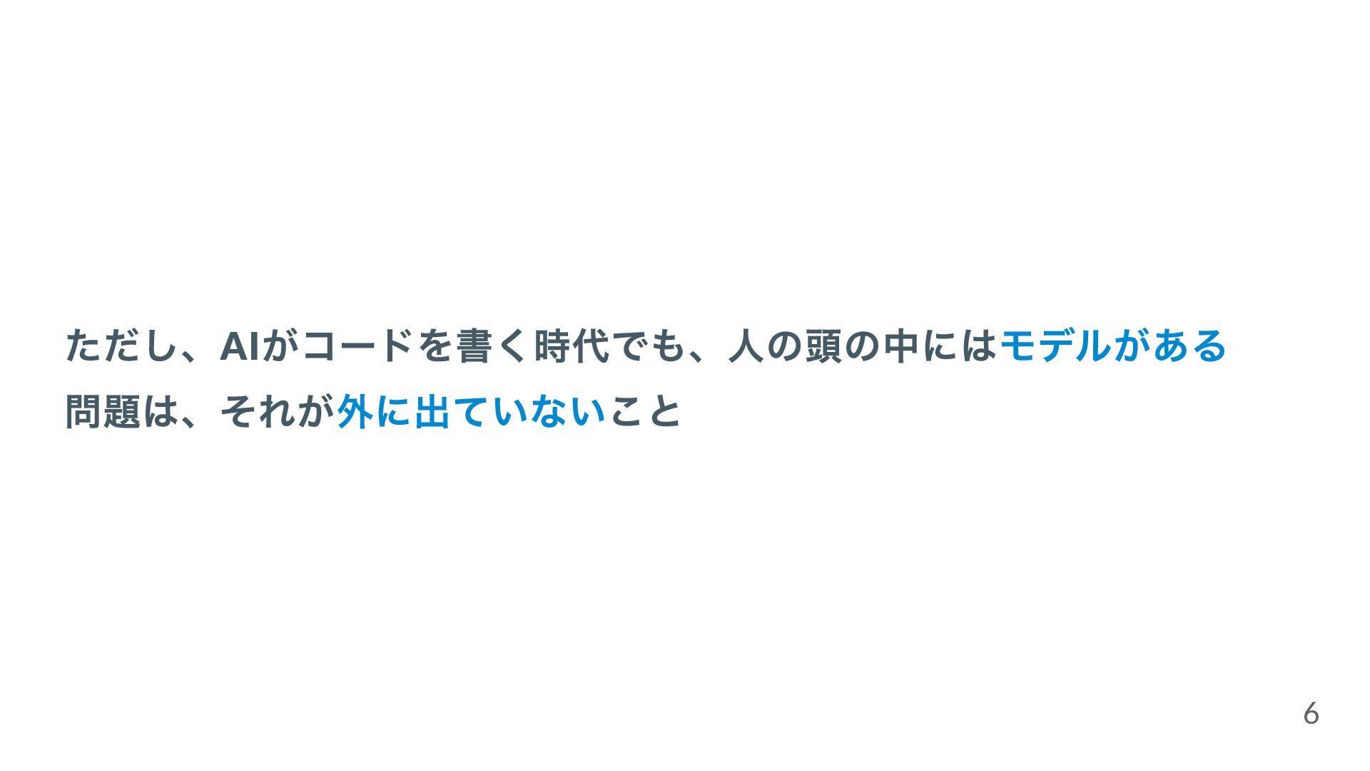 ただし、AI がコードを書く時代でも、人の頭の中にはモデルがある 問題は、それが外に出ていないこと 6