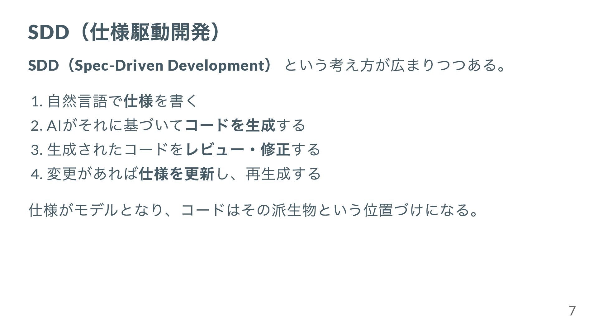 SDD (仕様駆動開発) SDD (Spec-Driven Development ) という考え方が広まりつつある。 1. 自然言語で仕様を書く 2.