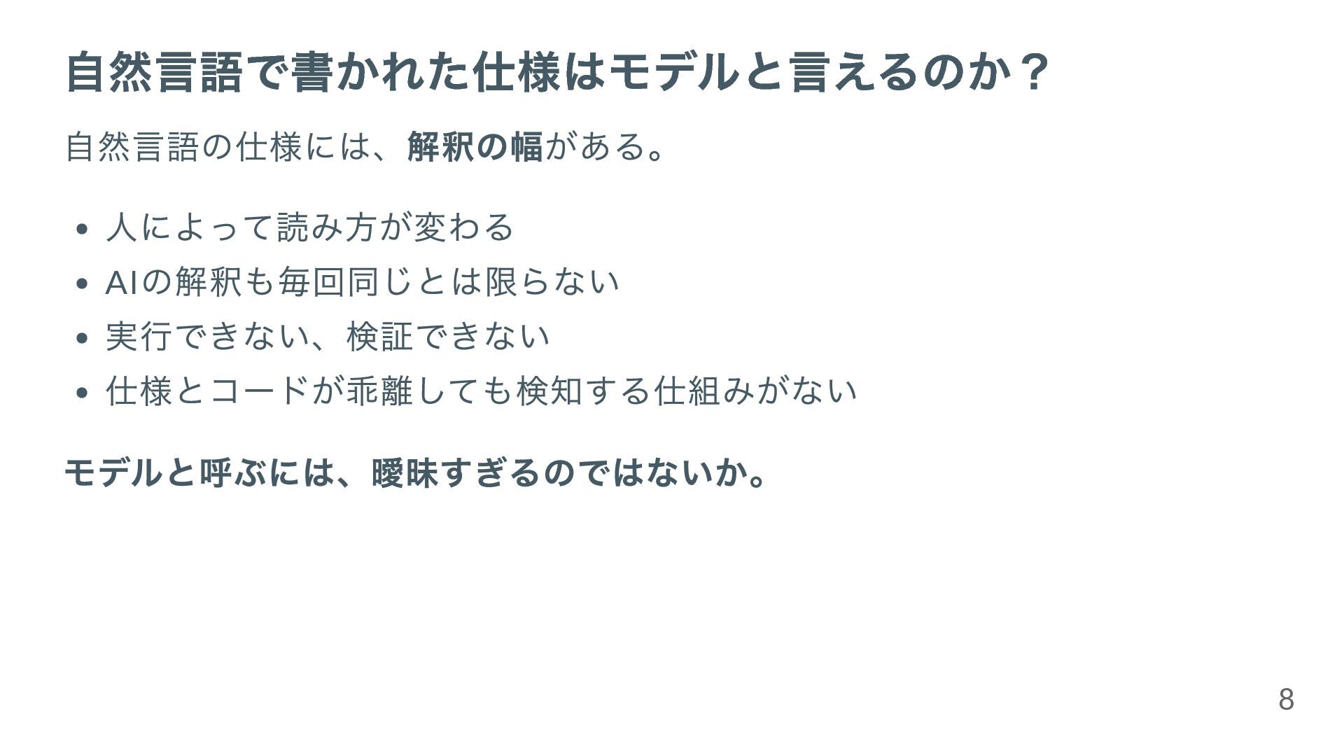 自然言語で書かれた仕様はモデルと言えるのか? 自然言語の仕様には、解釈の幅がある。 人によって読み方が変わる AI の解釈も毎回同じとは限らない 実行できない、検証できない 仕様とコードが乖離しても検知する仕組みがない モデルと呼ぶには、曖昧すぎるのではないか。 8