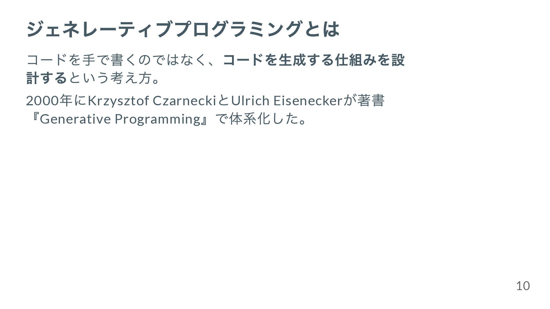 ジェネレーティブプログラミングとは コードを手で書くのではなく、コードを生成する仕組みを設 計するという考え方。 2000 年にKrzysztof Czarnecki とUlrich Eisenecker が著書 『Generative