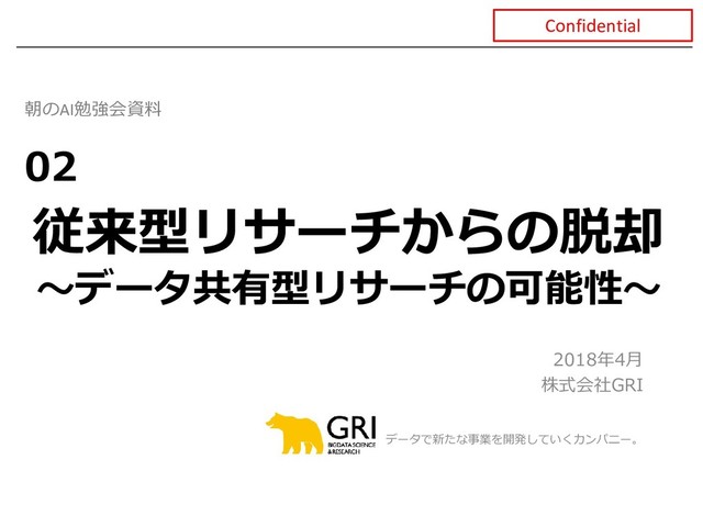 2018年4月 株式会社GRI データで新たな事業を開発していくカンパニー。 Confidential 従来型リサーチからの脱却 〜データ共有型リサーチの可能性〜 朝のAI勉強会資料 02