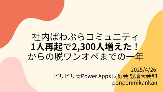 社内ぱわぷらコミュニティ 1人再起で2,300人増えた! からの脱ワンオペまでの一年 2025/4/26 ビリビリ☆Power Apps 同好会 登壇大会#3 ponponmikankan