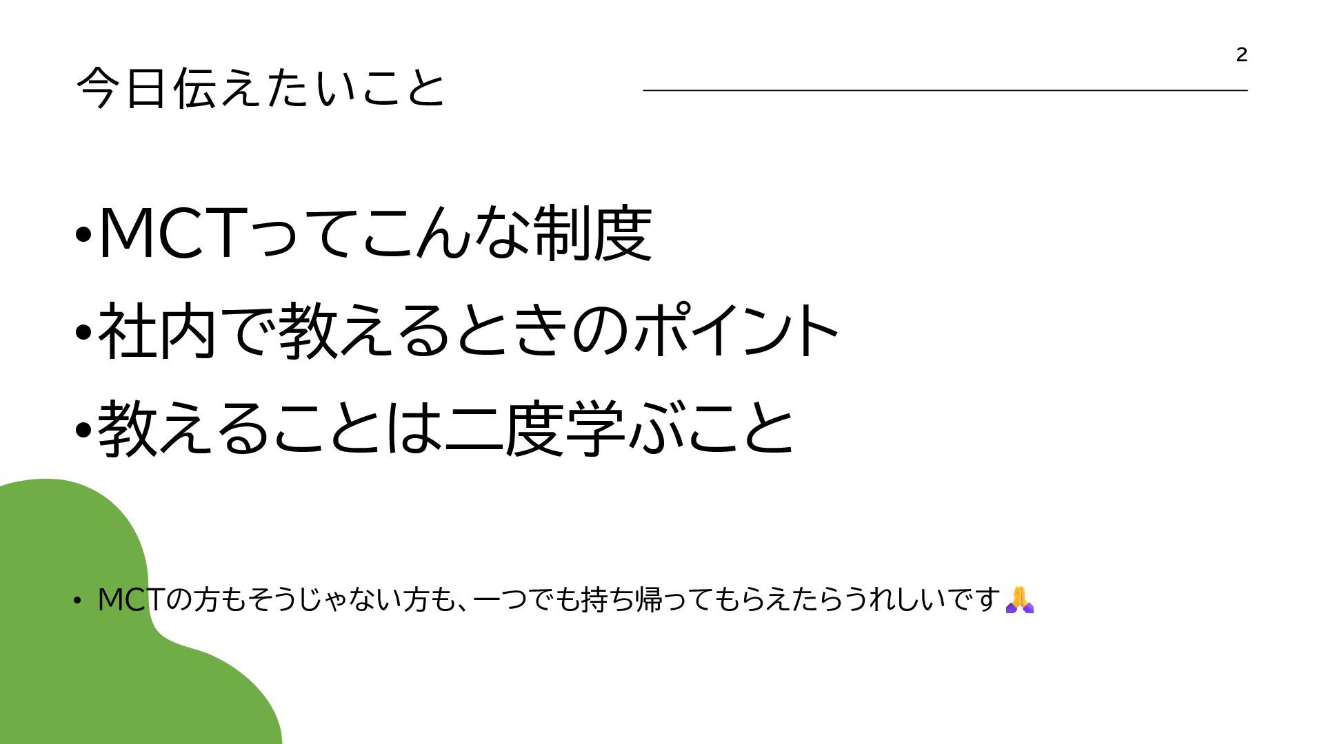 今日伝えたいこと 2 •MCTってこんな制度 •社内で教えるときのポイント •教えることは二度学ぶこと • MCTの方もそうじゃない方も、一つでも持ち帰ってもらえたらうれしいです