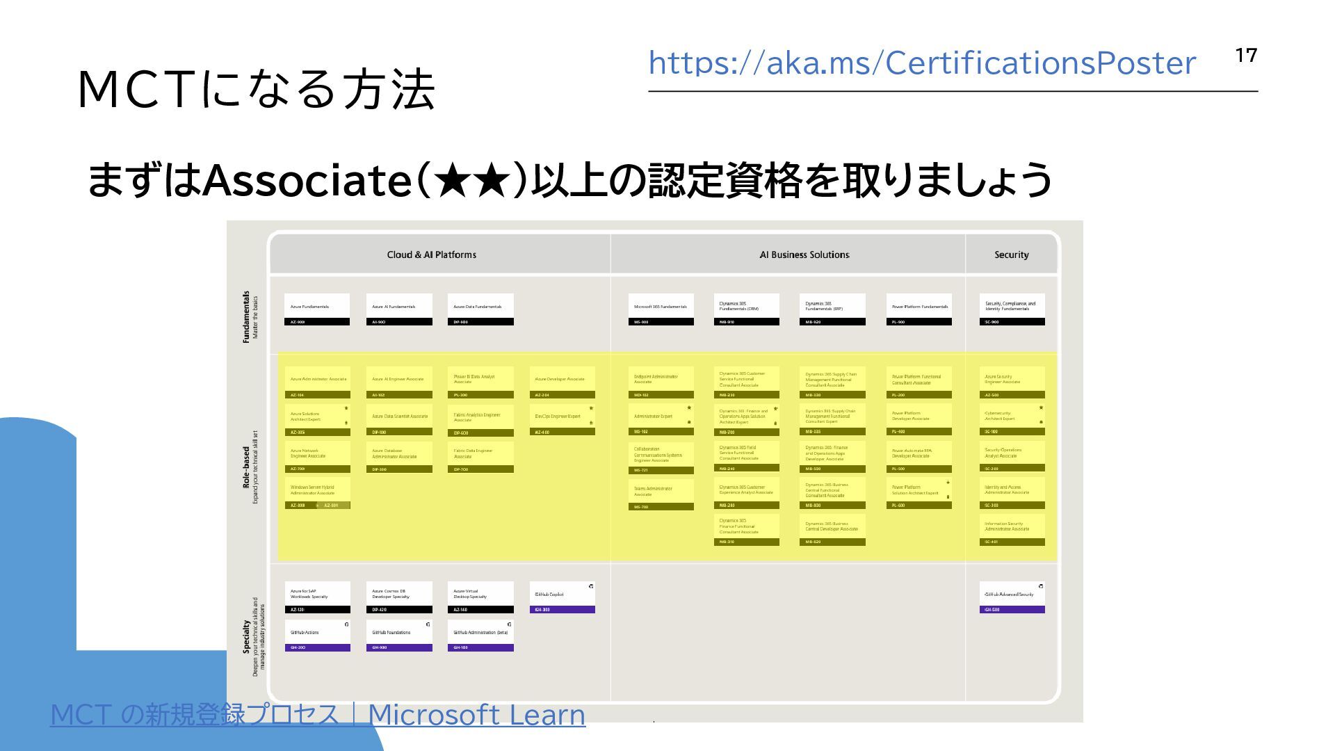 MCTになる方法 17 まずはAssociate(★★)以上の認定資格を取りましょう https://aka.ms/CertificationsPoster MCT の新規登録プロセス | Microsoft Learn