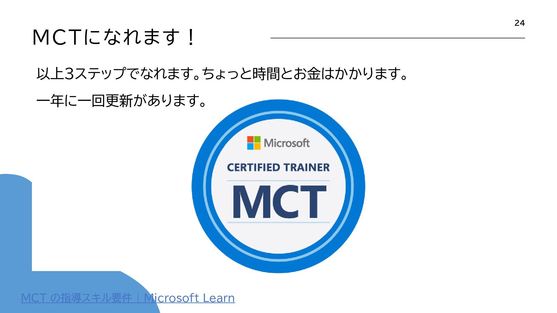 MCTになれます! 24 以上3ステップでなれます。ちょっと時間とお金はかかります。 一年に一回更新があります。 MCT の指導スキル要件 | Microsoft Learn