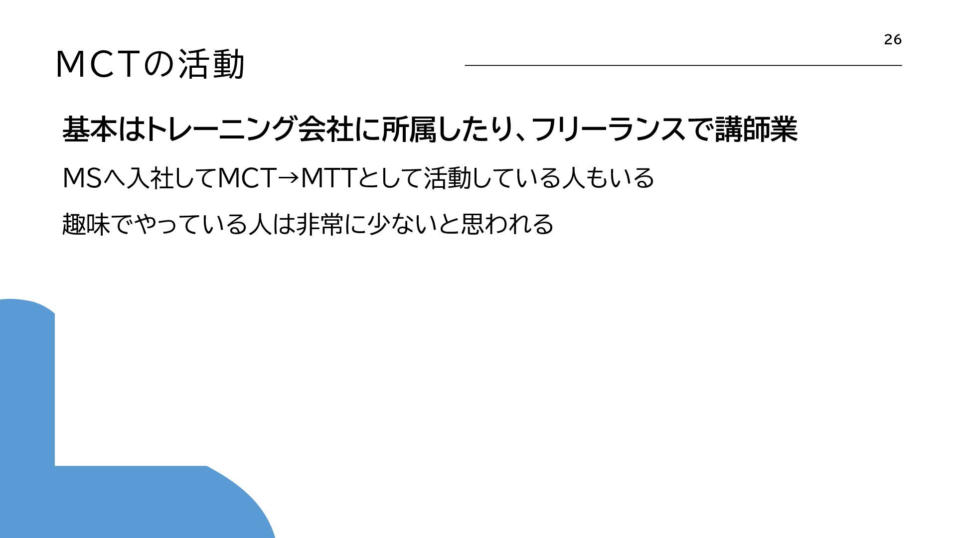 MCTの活動 26 基本はトレーニング会社に所属したり、フリーランスで講師業 MSへ入社してMCT→MTTとして活動している人もいる 趣味でやっている人は非常に少ないと思われる