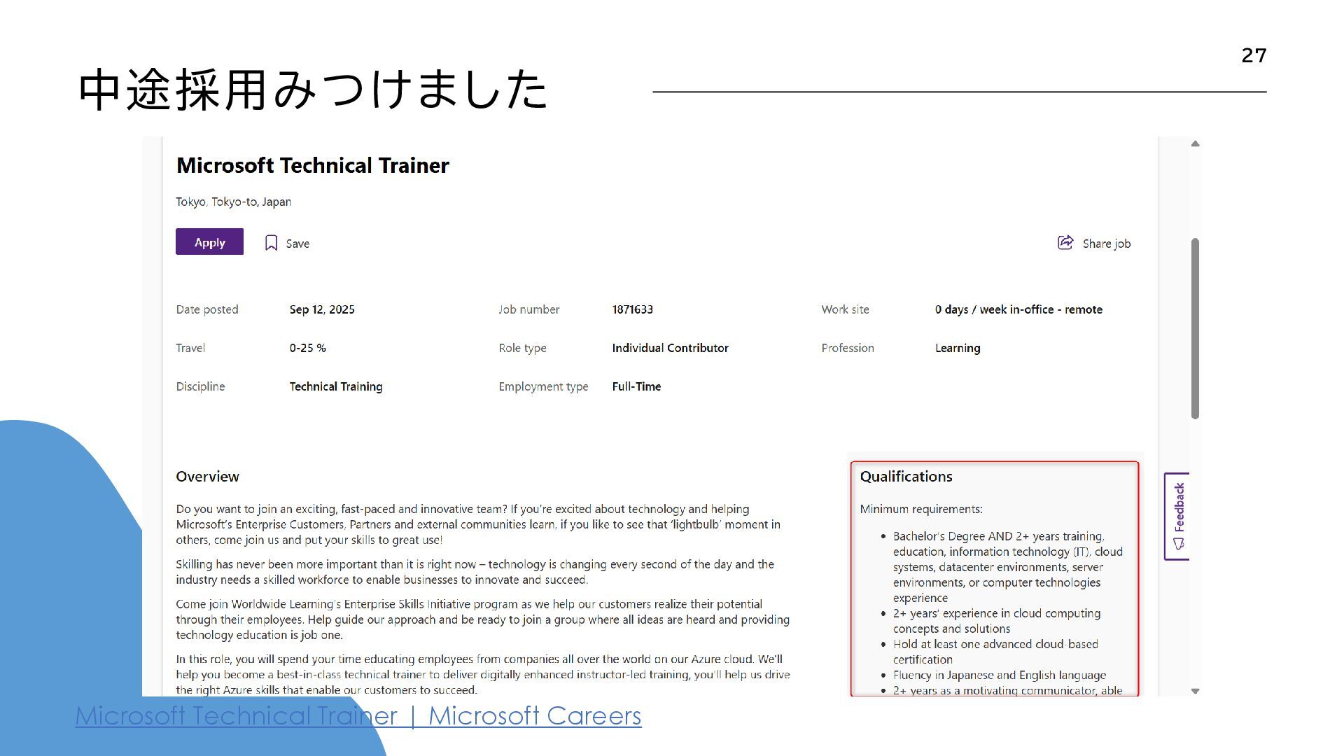 中途採用みつけました 27 Microsoft Technical Trainer | Microsoft Careers