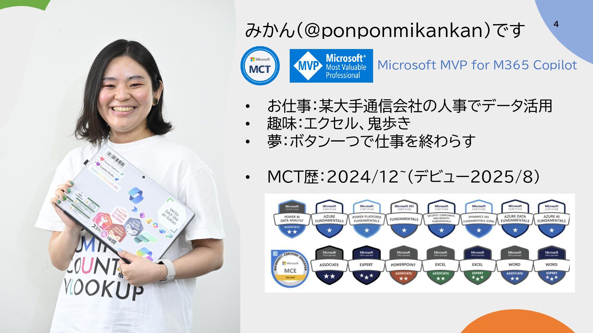 4 みかん(@ponponmikankan)です • お仕事:某大手通信会社の人事でデータ活用 • 趣味:エクセル、鬼歩き • 夢:ボタン一つで仕事を終わらす • MCT歴:2024/12~(デビュー2025/8)