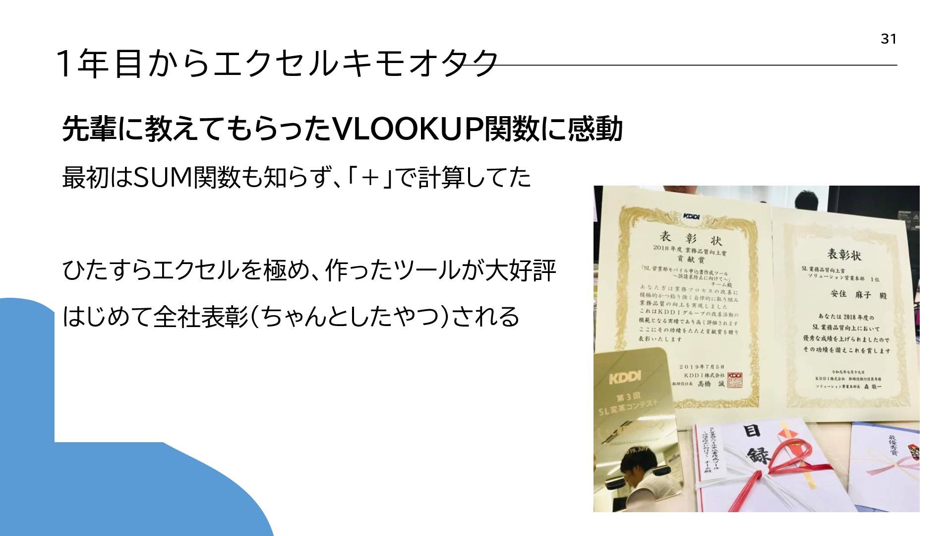 31 1年目からエクセルキモオタク 先輩に教えてもらったVLOOKUP関数に感動 最初はSUM関数も知らず、「+」で計算してた ひたすらエクセルを極め、作ったツールが大好評 はじめて全社表彰(ちゃんとしたやつ)される