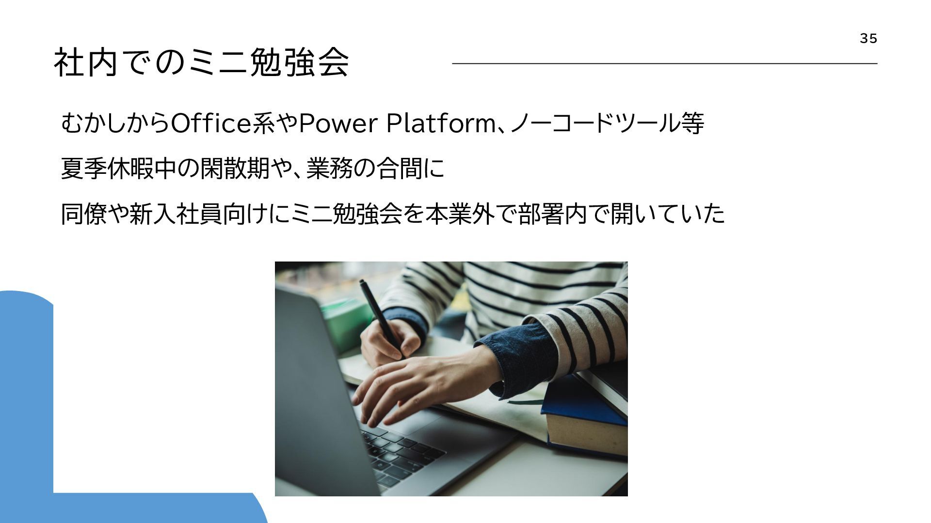 むかしからOffice系やPower Platform、ノーコードツール等 夏季休暇中の閑散期や、業務の合間に 同僚や新入社員向けにミニ勉強会を本業外で部署内で開いていた 社内でのミニ勉強会 35