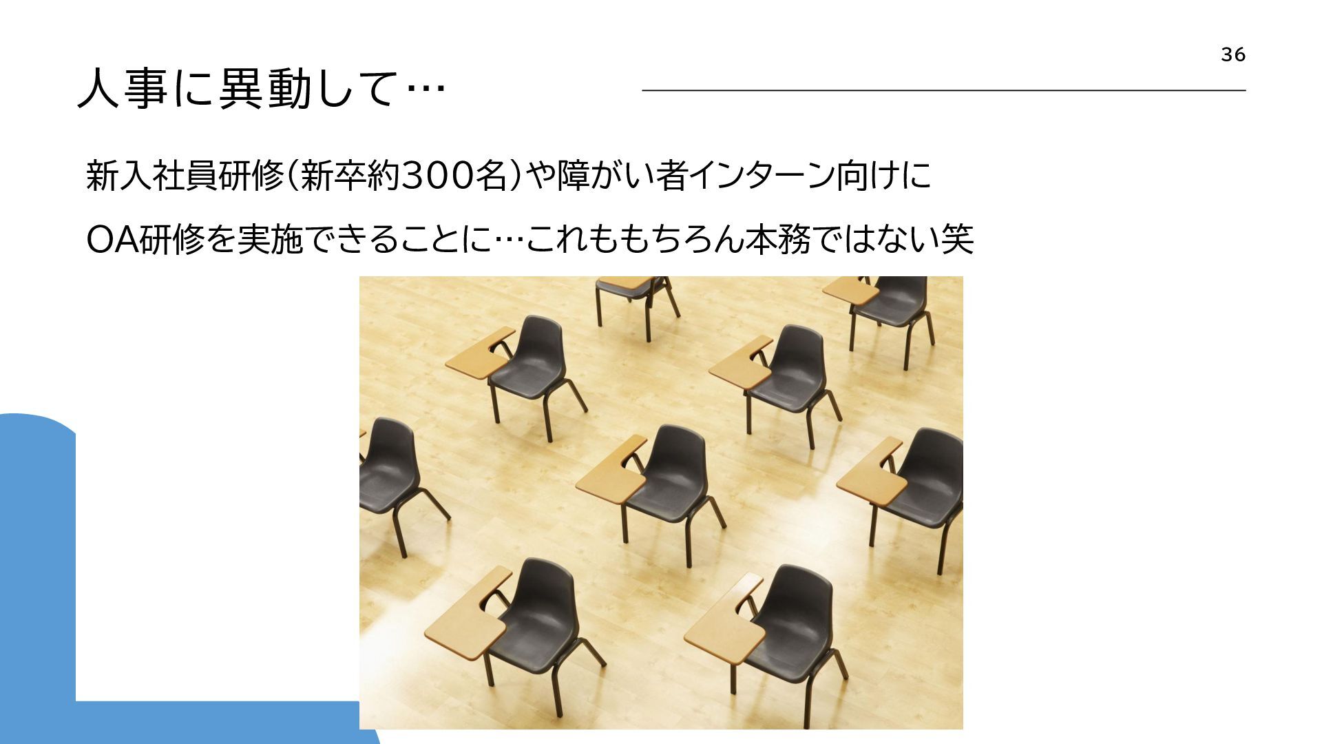 新入社員研修(新卒約300名)や障がい者インターン向けに OA研修を実施できることに…これももちろん本務ではない笑 人事に異動して… 36