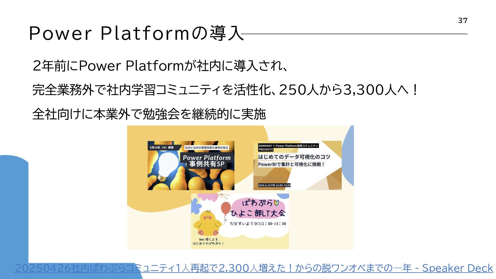 2年前にPower Platformが社内に導入され、 完全業務外で社内学習コミュニティを活性化、250人から3,300人へ! 全社向けに本業外で勉強会を継続的に実施 Power Platformの導入 37 20250426社内ぱわぷらコミュニティ1⼈再起で2,300⼈増えた!からの脱ワンオペまでの⼀年 - Speaker