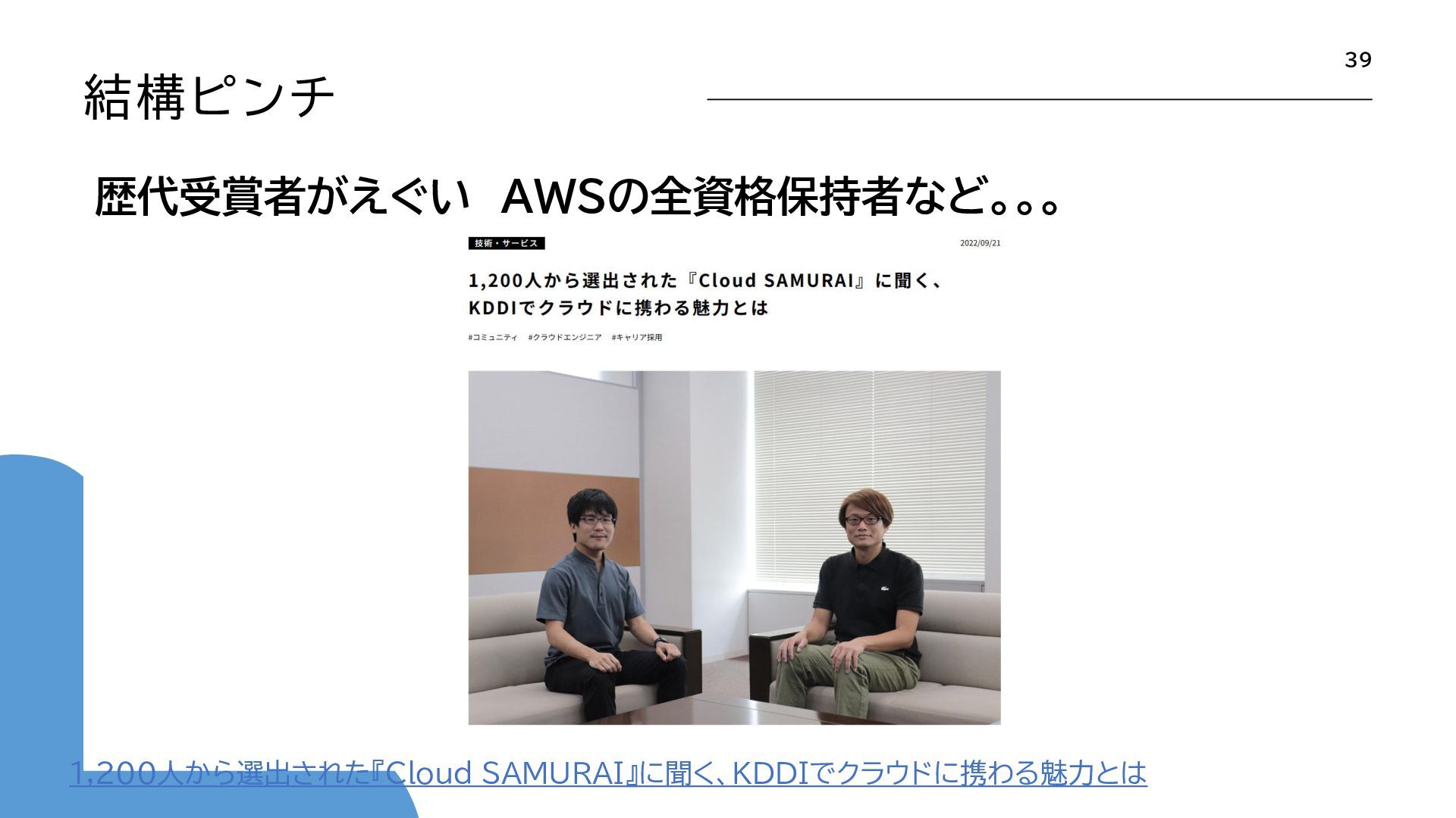 歴代受賞者がえぐい AWSの全資格保持者など。。。 結構ピンチ 39 1,200人から選出された『Cloud SAMURAI』に聞く、KDDIでクラウドに携わる魅力とは
