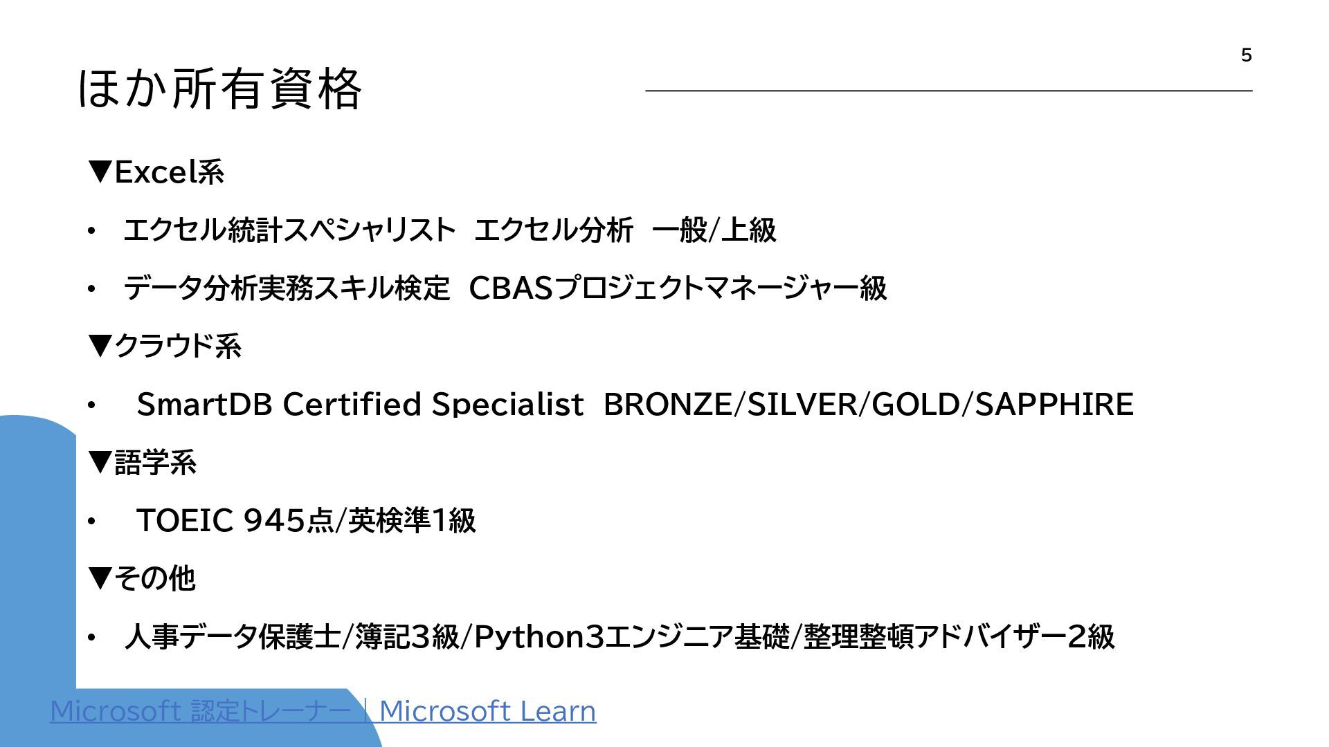 ▼クラウド系 • SmartDB Certified Specialist BRONZE/SILVER/GOLD/SAPPHIRE ▼語学系 • TOEIC 945点/英検準1級 ▼その他 • 人事データ保護士/簿記3級/Python3エンジニア基礎/整理整頓アドバイザー2級 Microsoft 認定トレーナー | Microsoft Learn