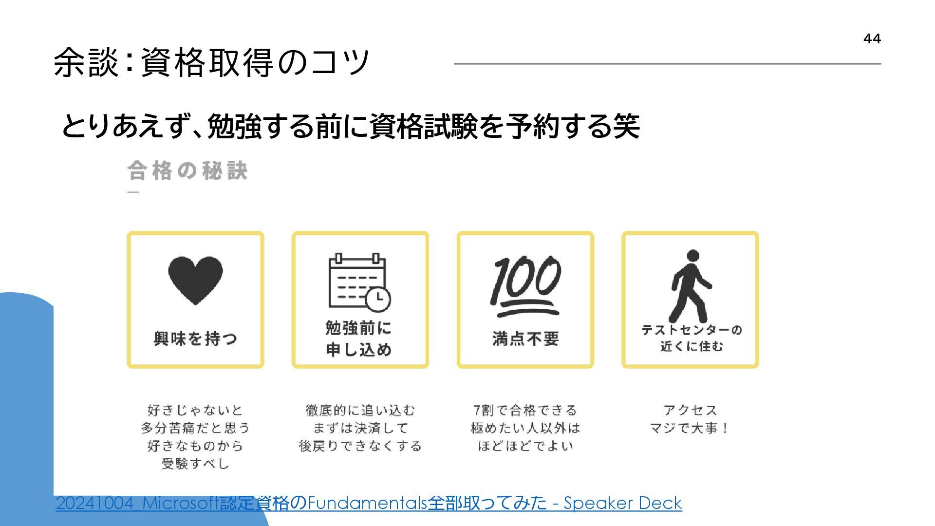 とりあえず、勉強する前に資格試験を予約する笑 余談:資格取得のコツ 44 20241004_Microsoft認定資格のFundamentals全部取ってみた - Speaker Deck