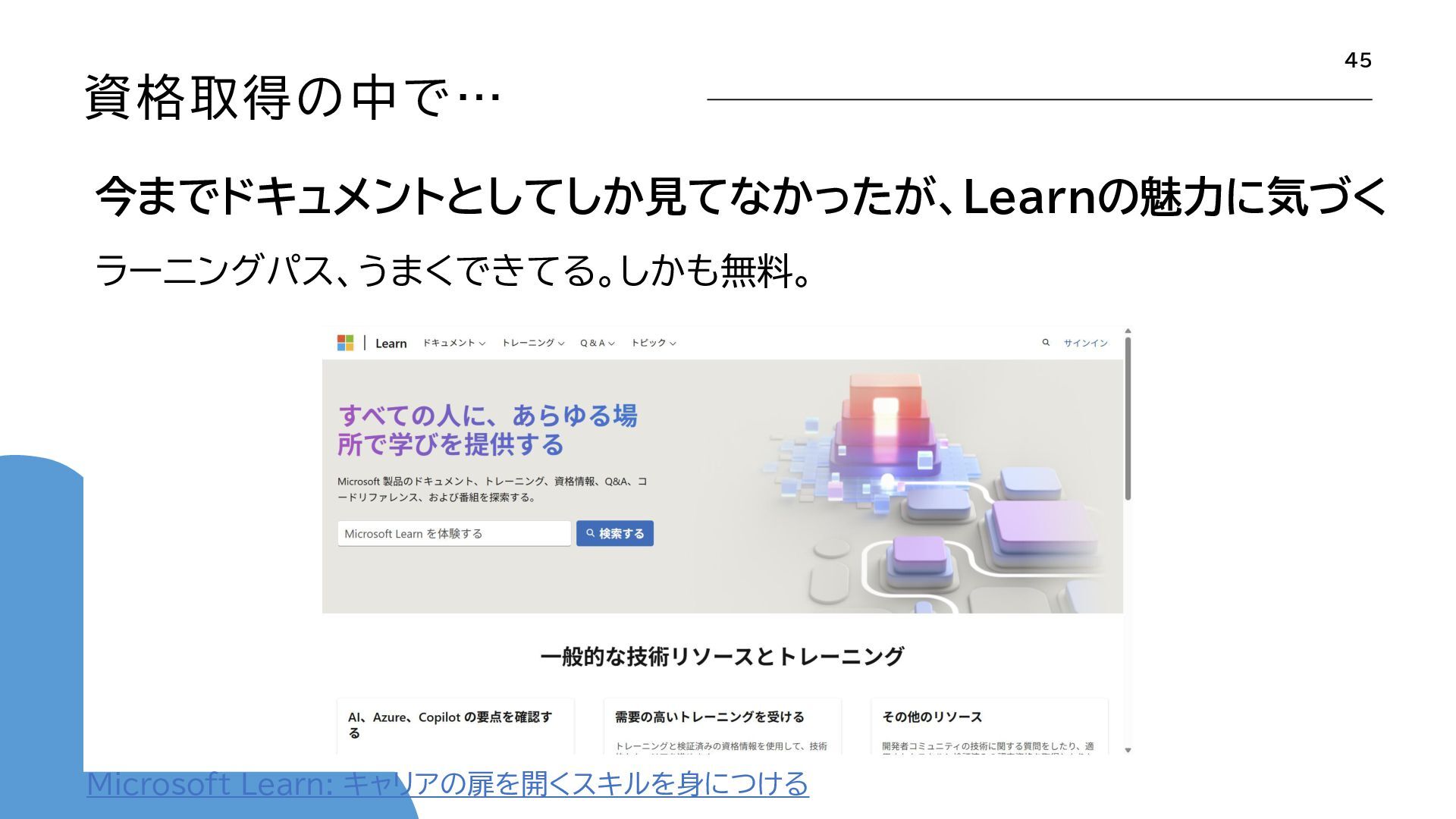 今までドキュメントとしてしか見てなかったが、Learnの魅力に気づく ラーニングパス、うまくできてる。しかも無料。 資格取得の中で… 45 Microsoft Learn: キャリアの扉を開くスキルを身につける