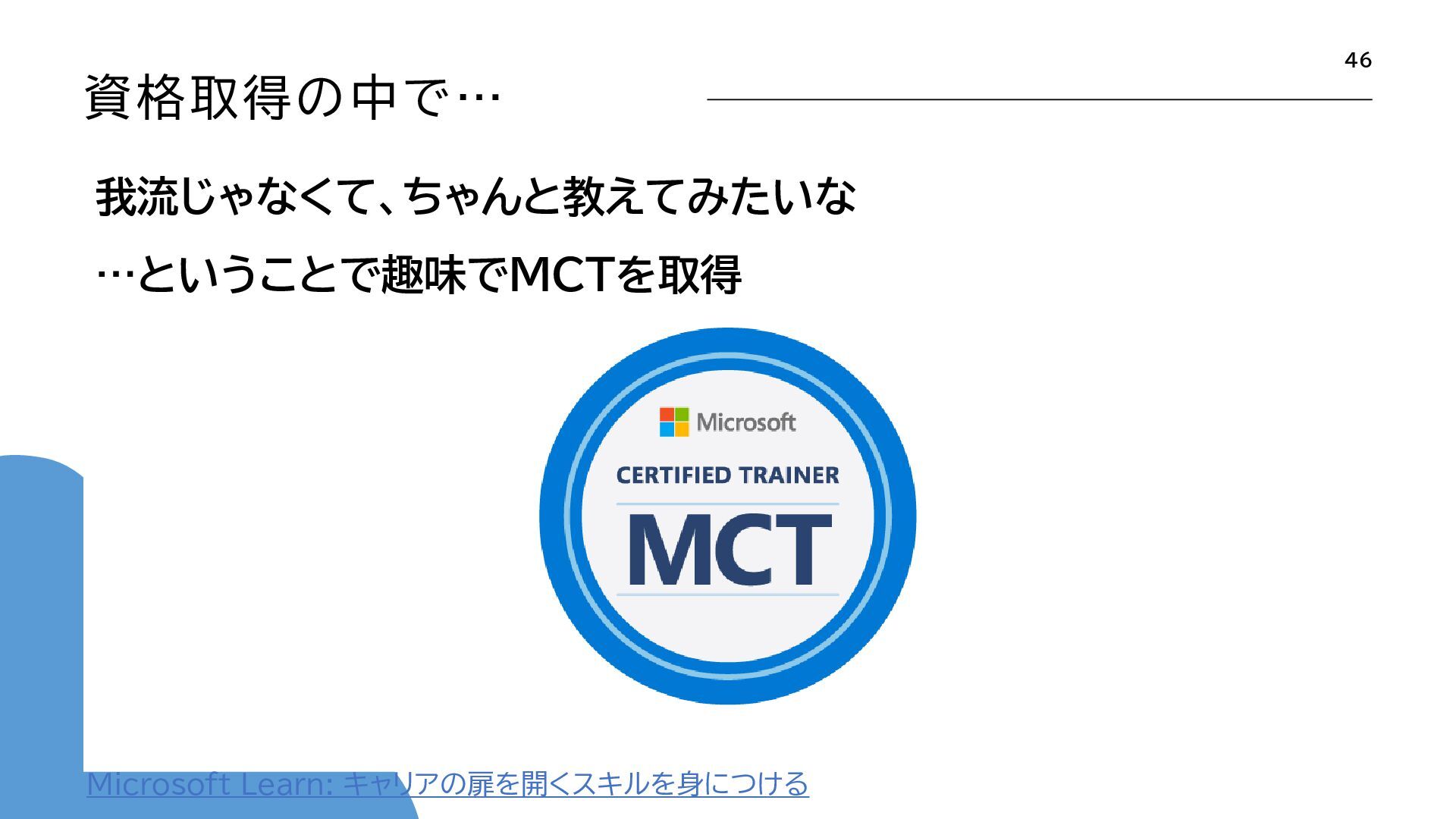 我流じゃなくて、ちゃんと教えてみたいな …ということで趣味でMCTを取得 資格取得の中で… 46 Microsoft Learn: キャリアの扉を開くスキルを身につける