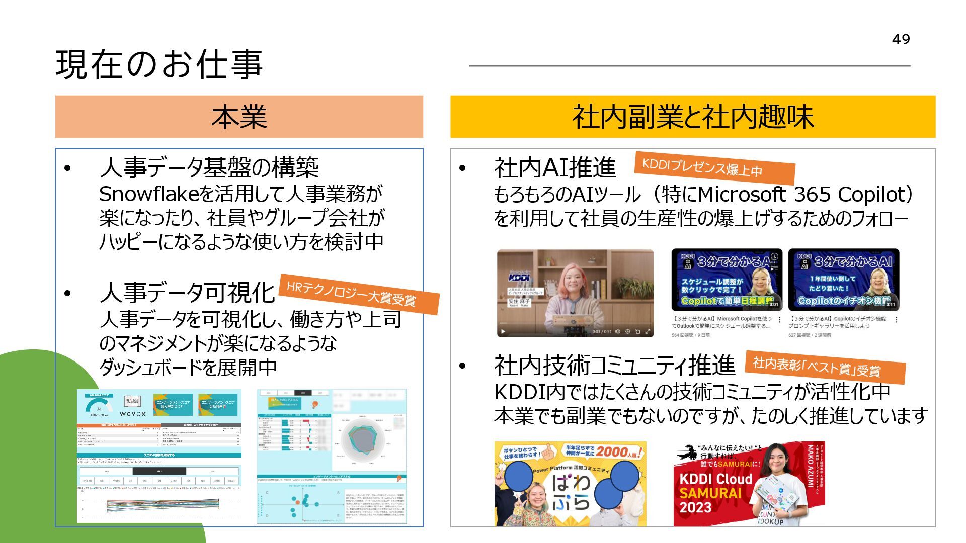 人事データ可視化 人事データを可視化し、働き方や上司 のマネジメントが楽になるような ダッシュボードを展開中 • 社内AI推進 もろもろのAIツール(特にMicrosoft 365 Copilot) を利用して社員の生産性の爆上げするためのフォロー • 社内技術コミュニティ推進 KDDI内ではたくさんの技術コミュニティが活性化中 本業でも副業でもないのですが、たのしく推進しています