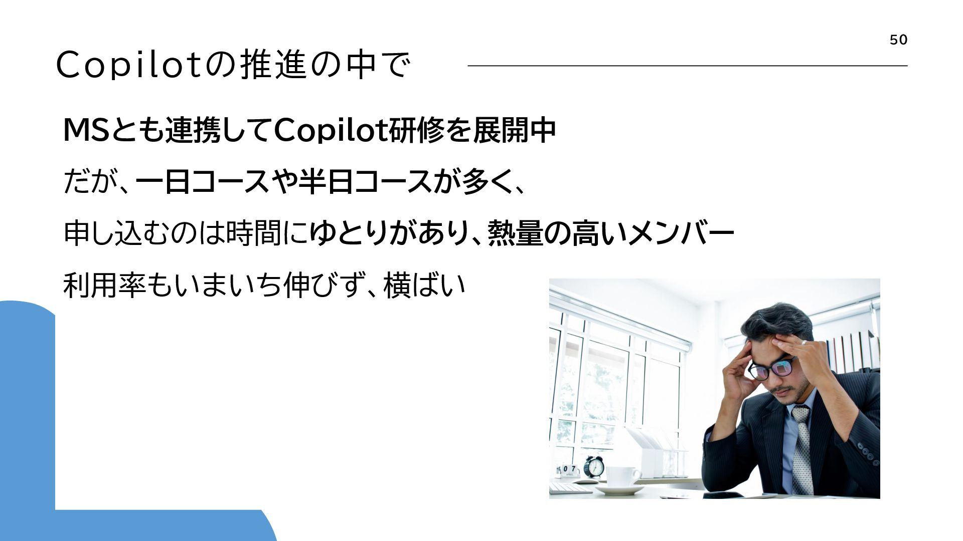 MSとも連携してCopilot研修を展開中 だが、一日コースや半日コースが多く、 申し込むのは時間にゆとりがあり、熱量の高いメンバー 利用率もいまいち伸びず、横ばい Copilotの推進の中で 50