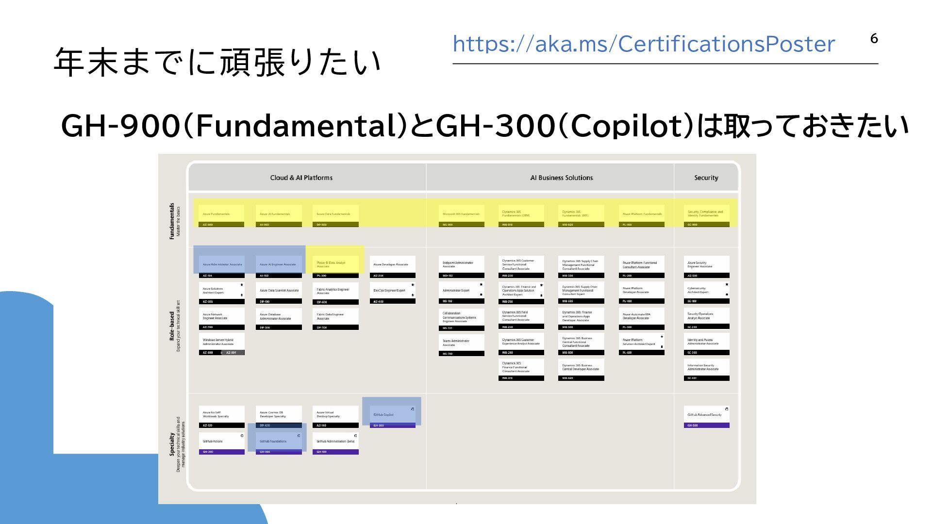 年末までに頑張りたい 6 GH-900(Fundamental)とGH-300(Copilot)は取っておきたい https://aka.ms/CertificationsPoster