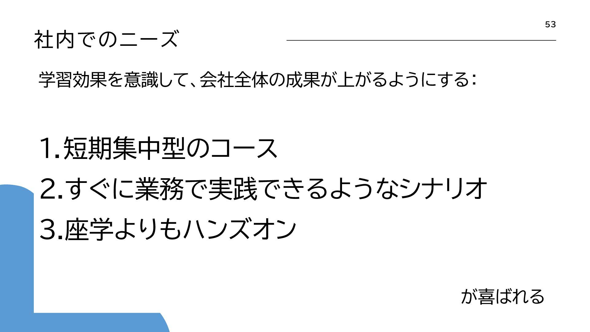 学習効果を意識して、会社全体の成果が上がるようにする: 1.短期集中型のコース 2.すぐに業務で実践できるようなシナリオ 3.座学よりもハンズオン が喜ばれる 社内でのニーズ 53