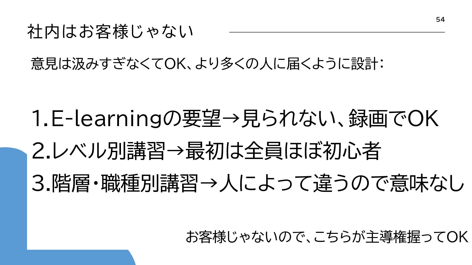 意見は汲みすぎなくてOK、より多くの人に届くように設計: 1.E-learningの要望→見られない、録画でOK 2.レベル別講習→最初は全員ほぼ初心者 3.階層・職種別講習→人によって違うので意味なし お客様じゃないので、こちらが主導権握ってOK 社内はお客様じゃない 54