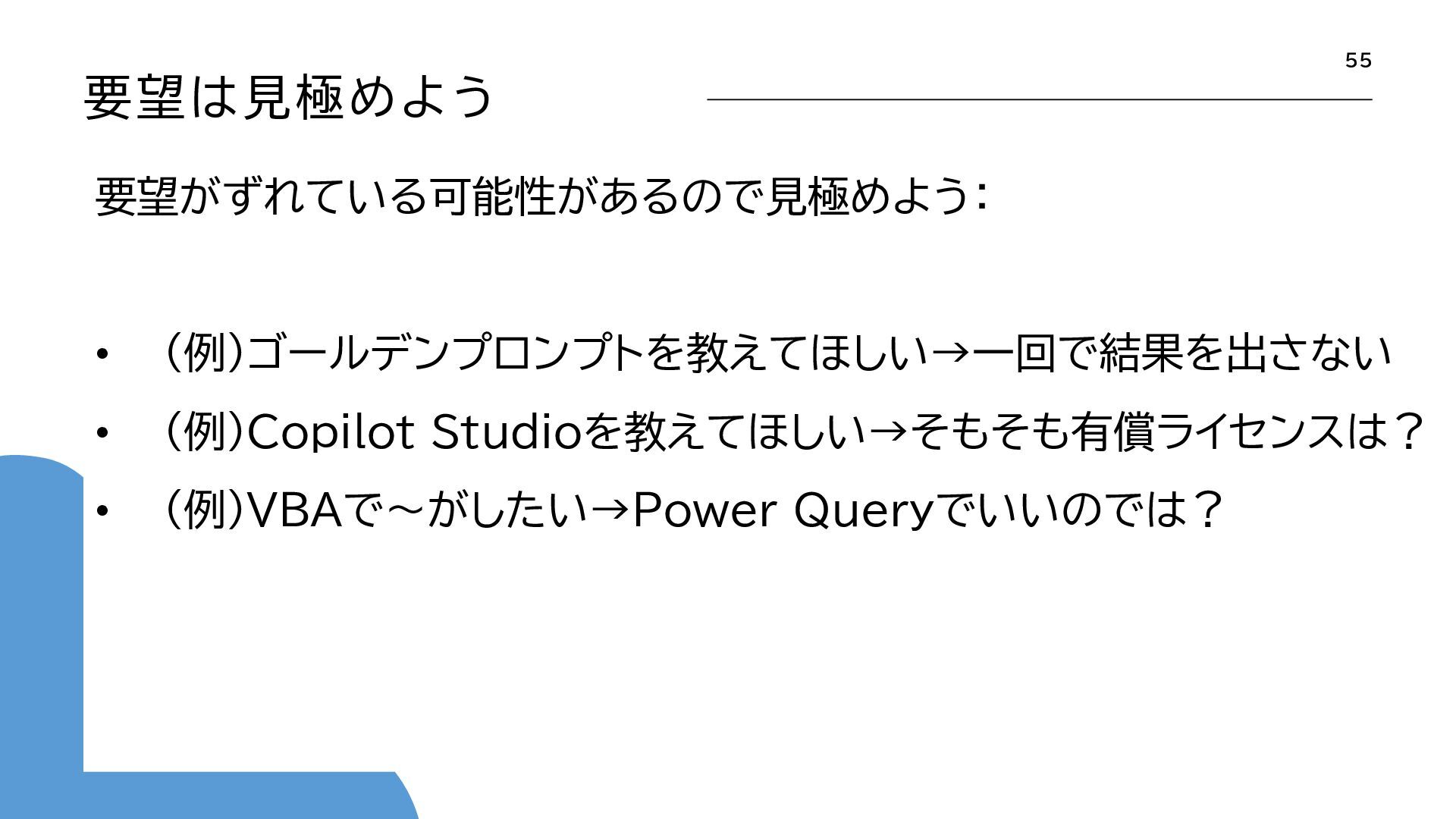 要望がずれている可能性があるので見極めよう: • (例)ゴールデンプロンプトを教えてほしい→一回で結果を出さない • (例)Copilot Studioを教えてほしい→そもそも有償ライセンスは? • (例)VBAで~がしたい→Power Queryでいいのでは? 要望は見極めよう