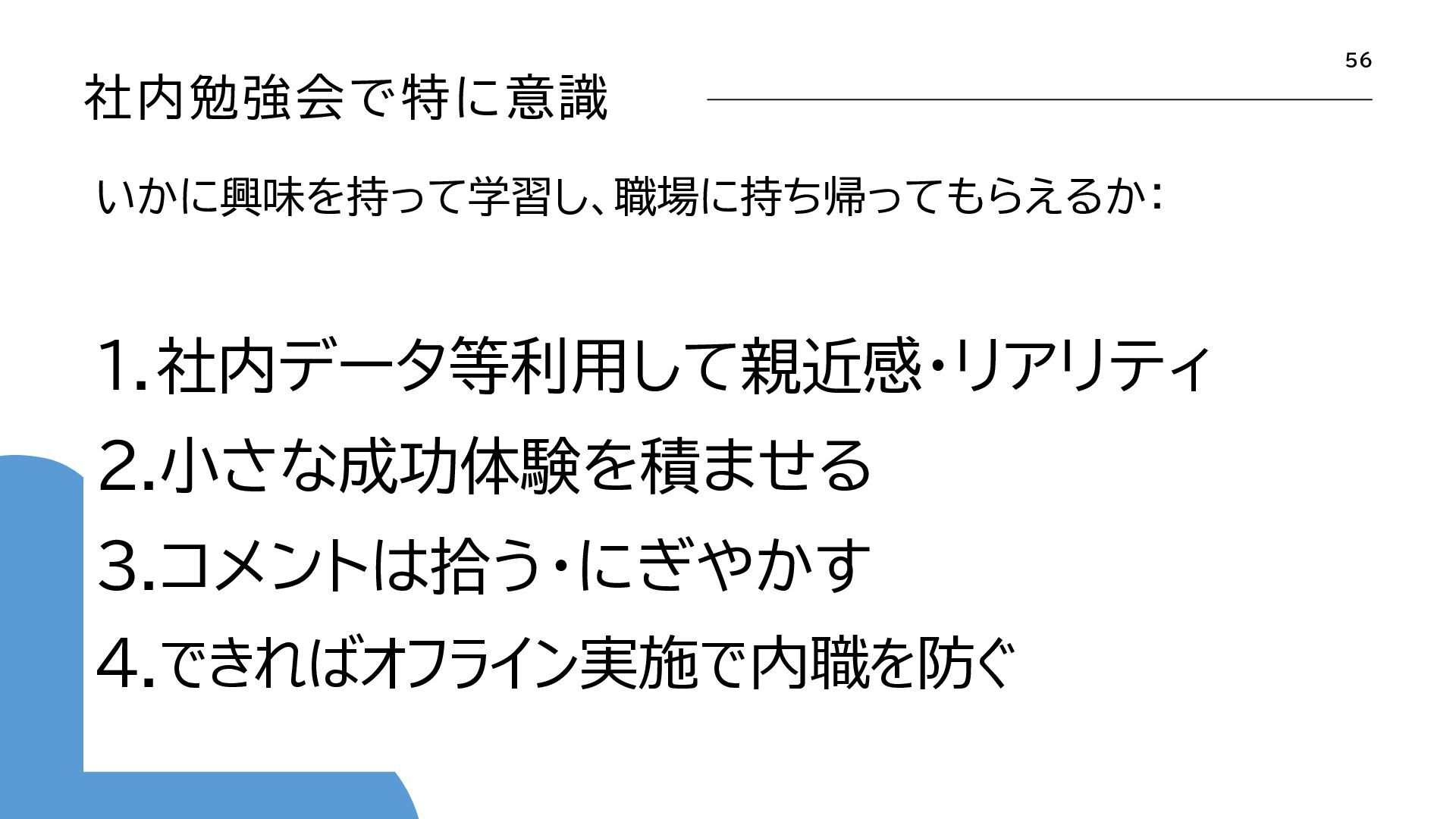 いかに興味を持って学習し、職場に持ち帰ってもらえるか: 1.社内データ等利用して親近感・リアリティ 2.小さな成功体験を積ませる 3.コメントは拾う・にぎやかす 4.できればオフライン実施で内職を防ぐ 社内勉強会で特に意識 56