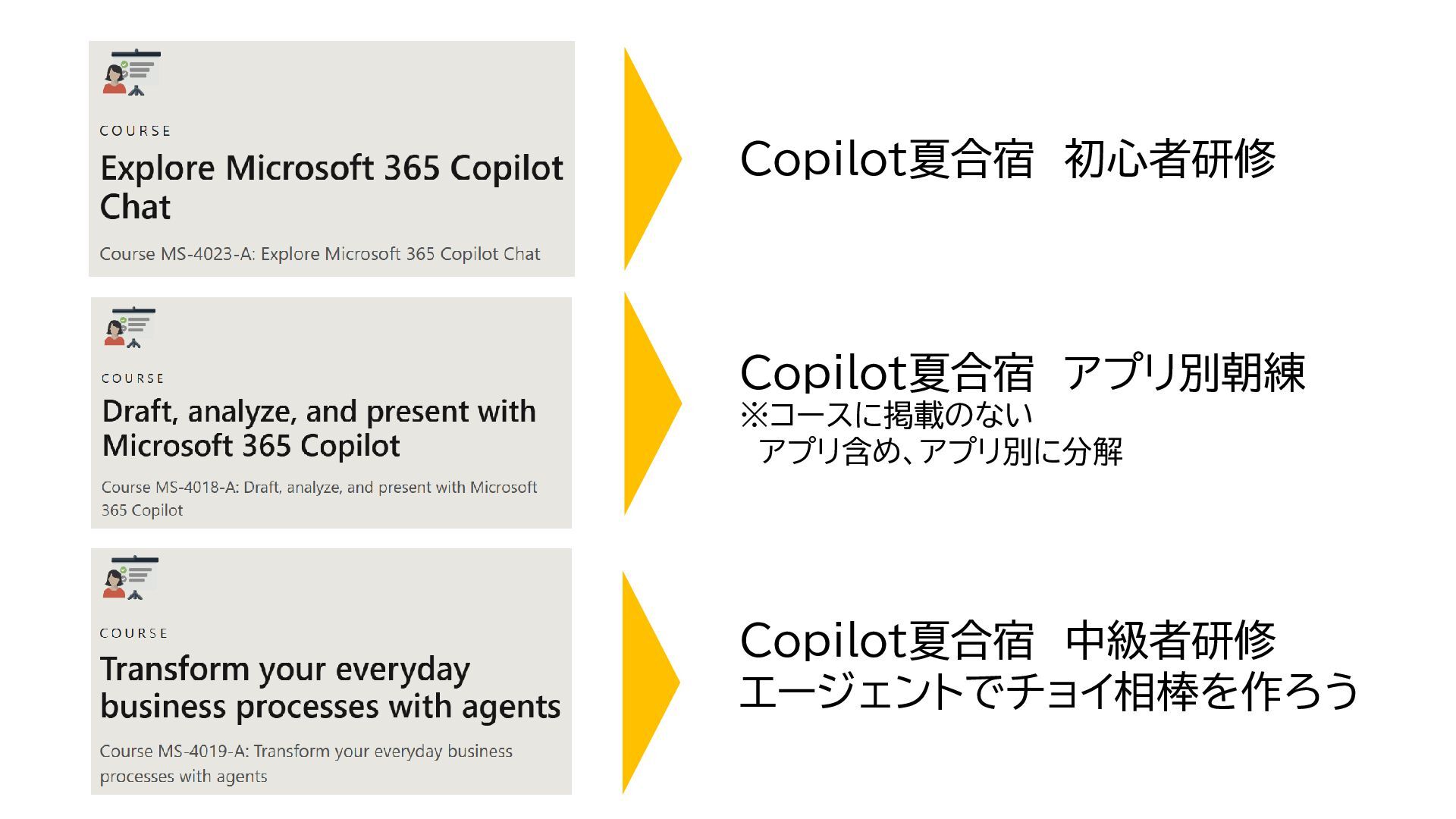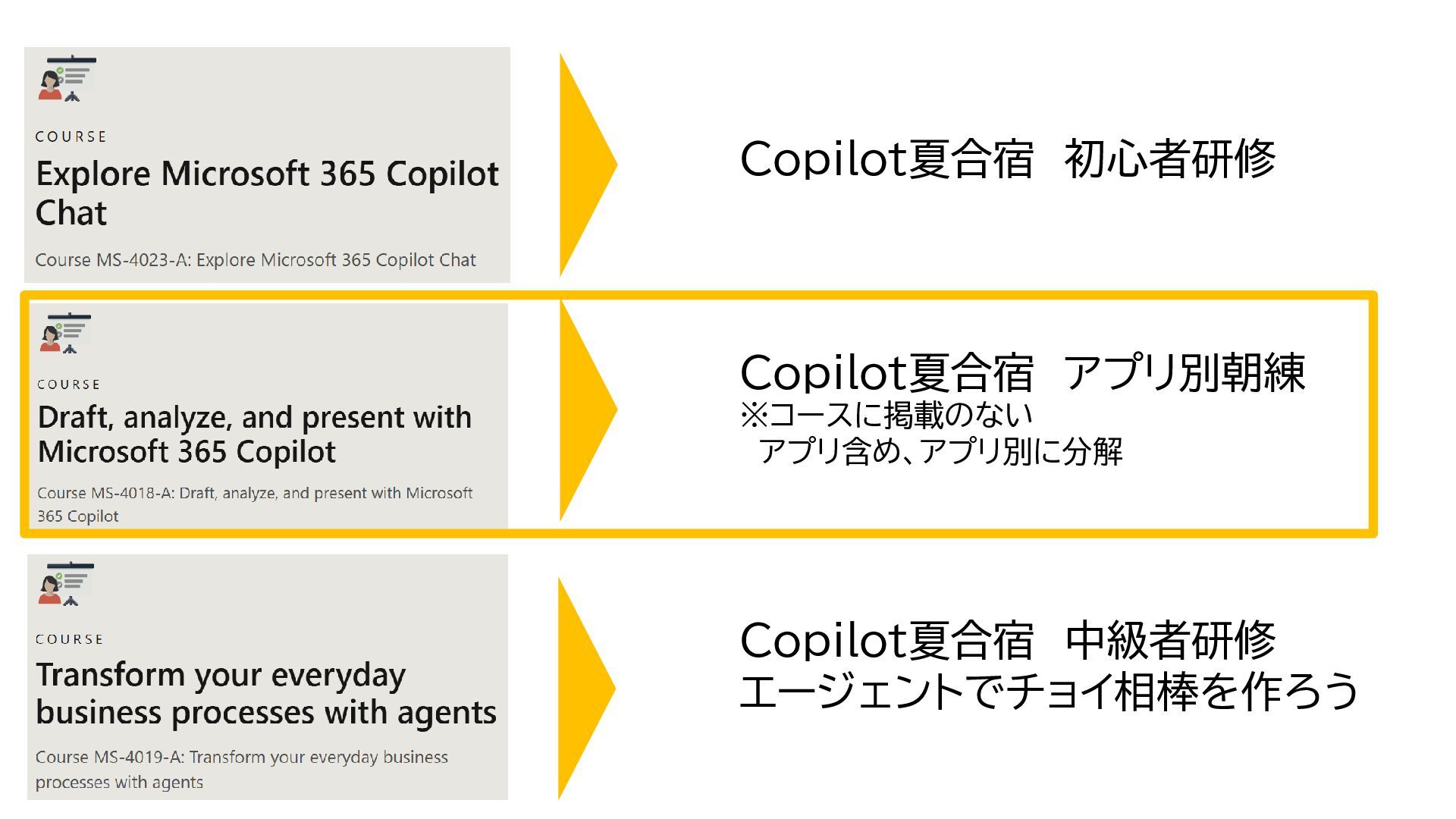 Copilot夏合宿 初心者研修 Copilot夏合宿 アプリ別朝練 ※コースに掲載のない アプリ含め、アプリ別に分解 Copilot夏合宿 中級者研修 エージェントでチョイ相棒を作ろう