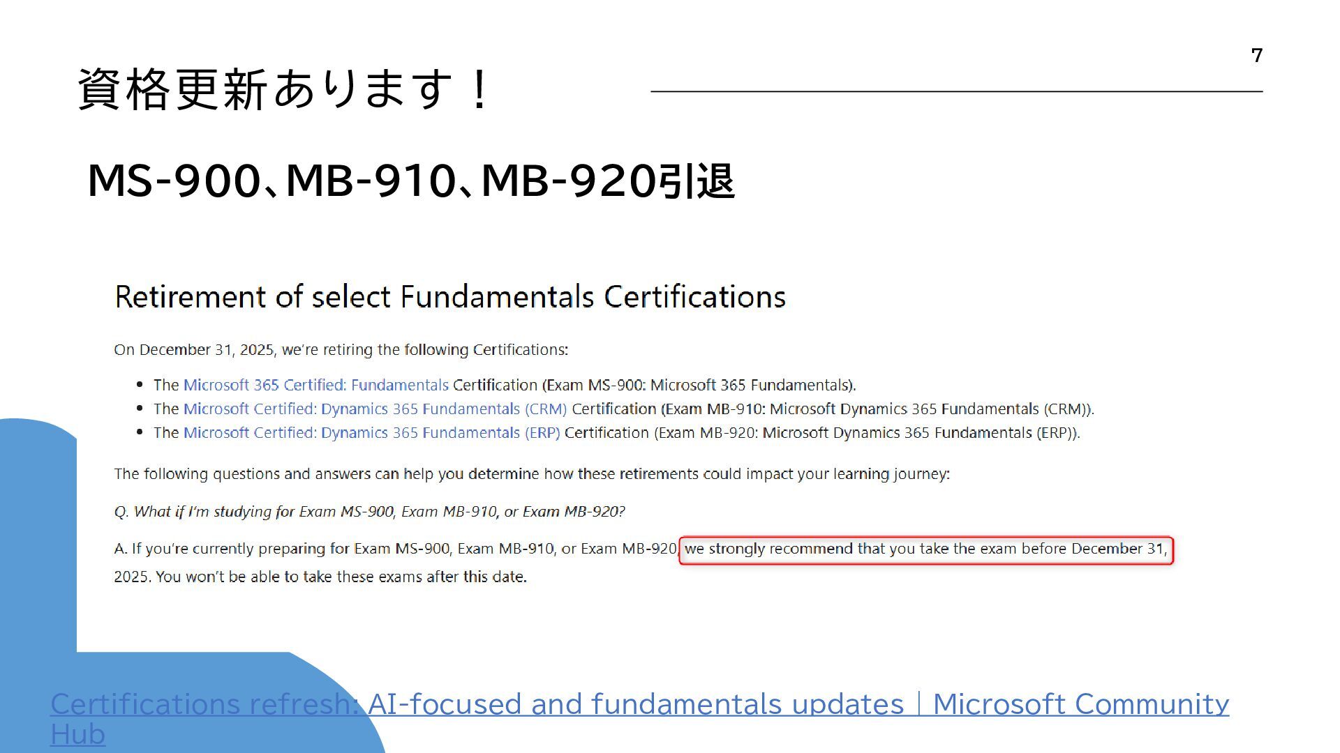 資格更新あります! 7 MS-900、MB-910、MB-920引退 Certifications refresh: AI-focused and fundamentals updates |