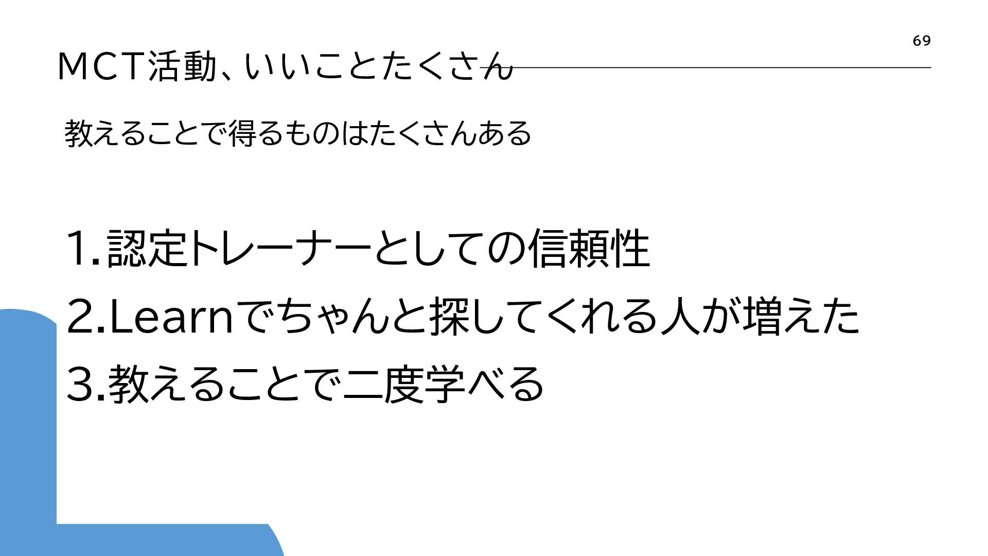 教えることで得るものはたくさんある 1.認定トレーナーとしての信頼性 2.Learnでちゃんと探してくれる人が増えた 3.教えることで二度学べる MCT活動、いいことたくさん 69