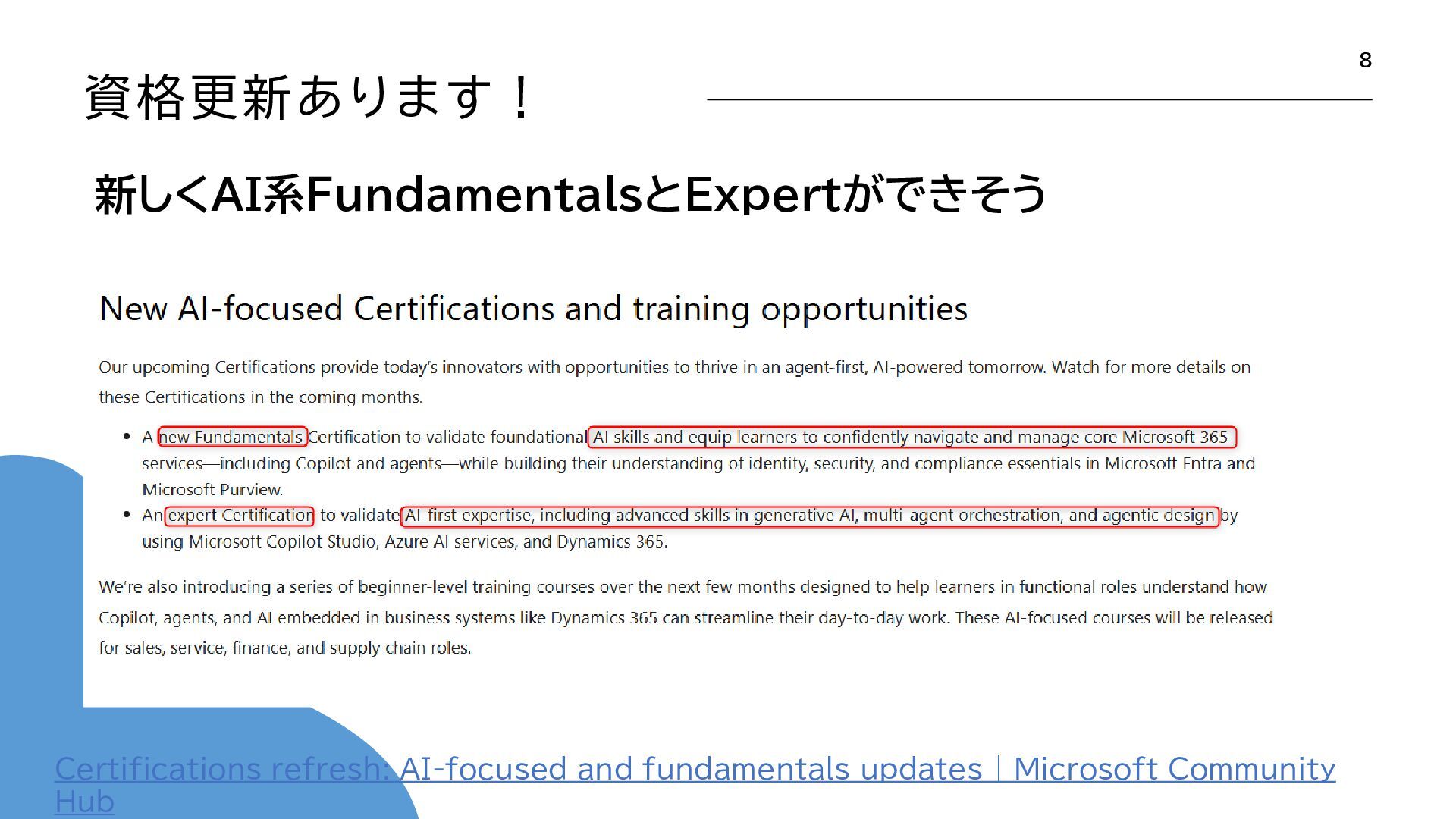 資格更新あります! 8 新しくAI系FundamentalsとExpertができそう Certifications refresh: AI-focused and fundamentals updates |