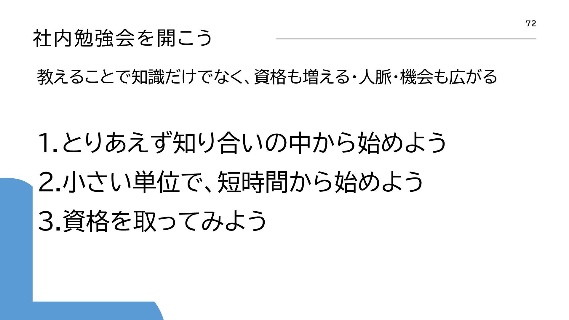 教えることで知識だけでなく、資格も増える・人脈・機会も広がる 1.とりあえず知り合いの中から始めよう 2.小さい単位で、短時間から始めよう 3.資格を取ってみよう 社内勉強会を開こう 72
