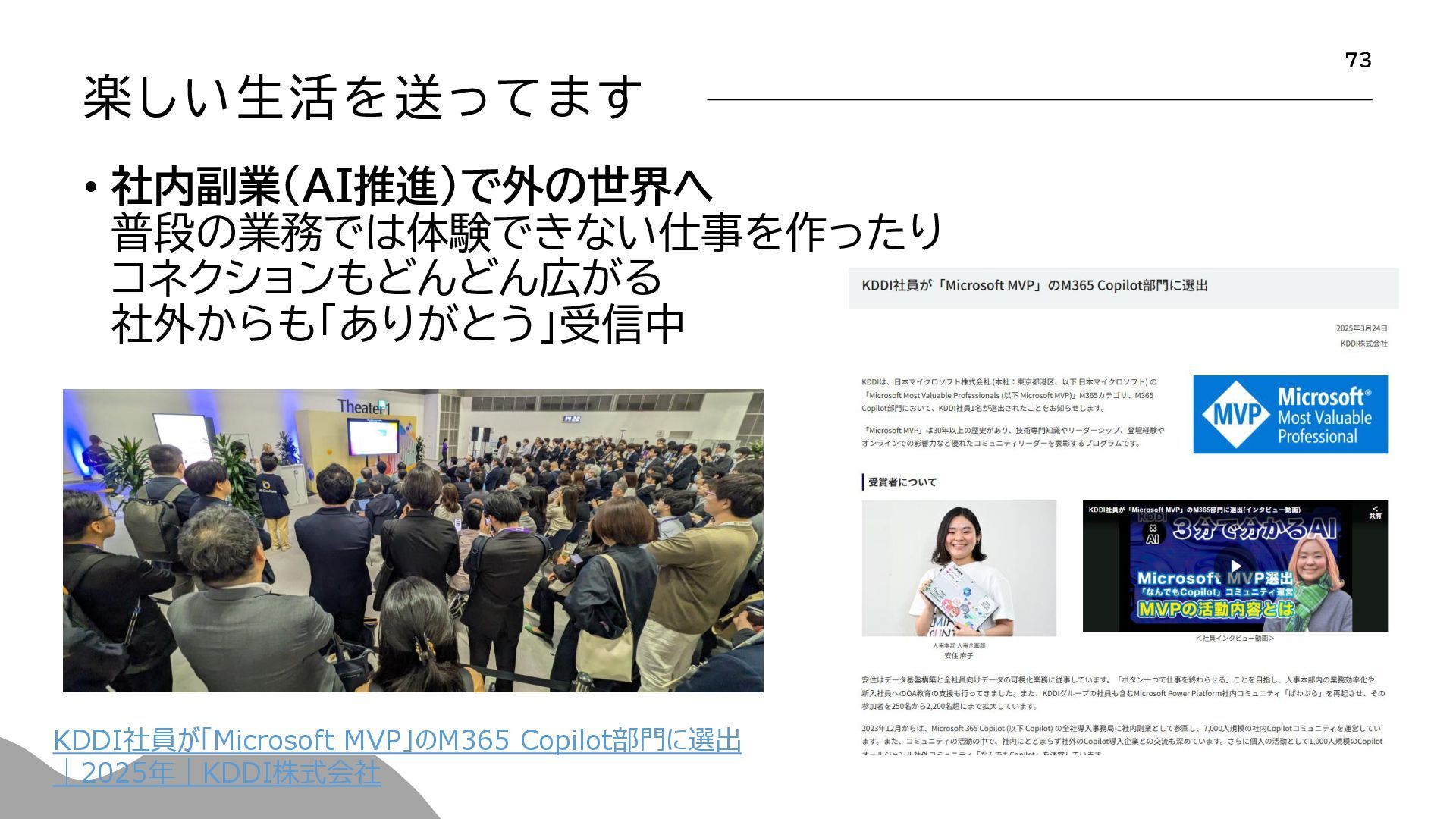 楽しい生活を送ってます 73 • 社内副業(AI推進)で外の世界へ 普段の業務では体験できない仕事を作ったり コネクションもどんどん広がる 社外からも「ありがとう」受信中 KDDI社員が「Microsoft MVP」のM365 Copilot部門に選出