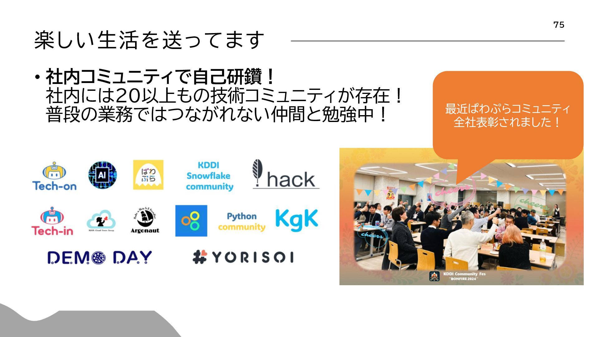 楽しい生活を送ってます 75 • 社内コミュニティで自己研鑽! 社内には20以上もの技術コミュニティが存在! 普段の業務ではつながれない仲間と勉強中! 最近ぱわぷらコミュニティ 全社表彰されました!