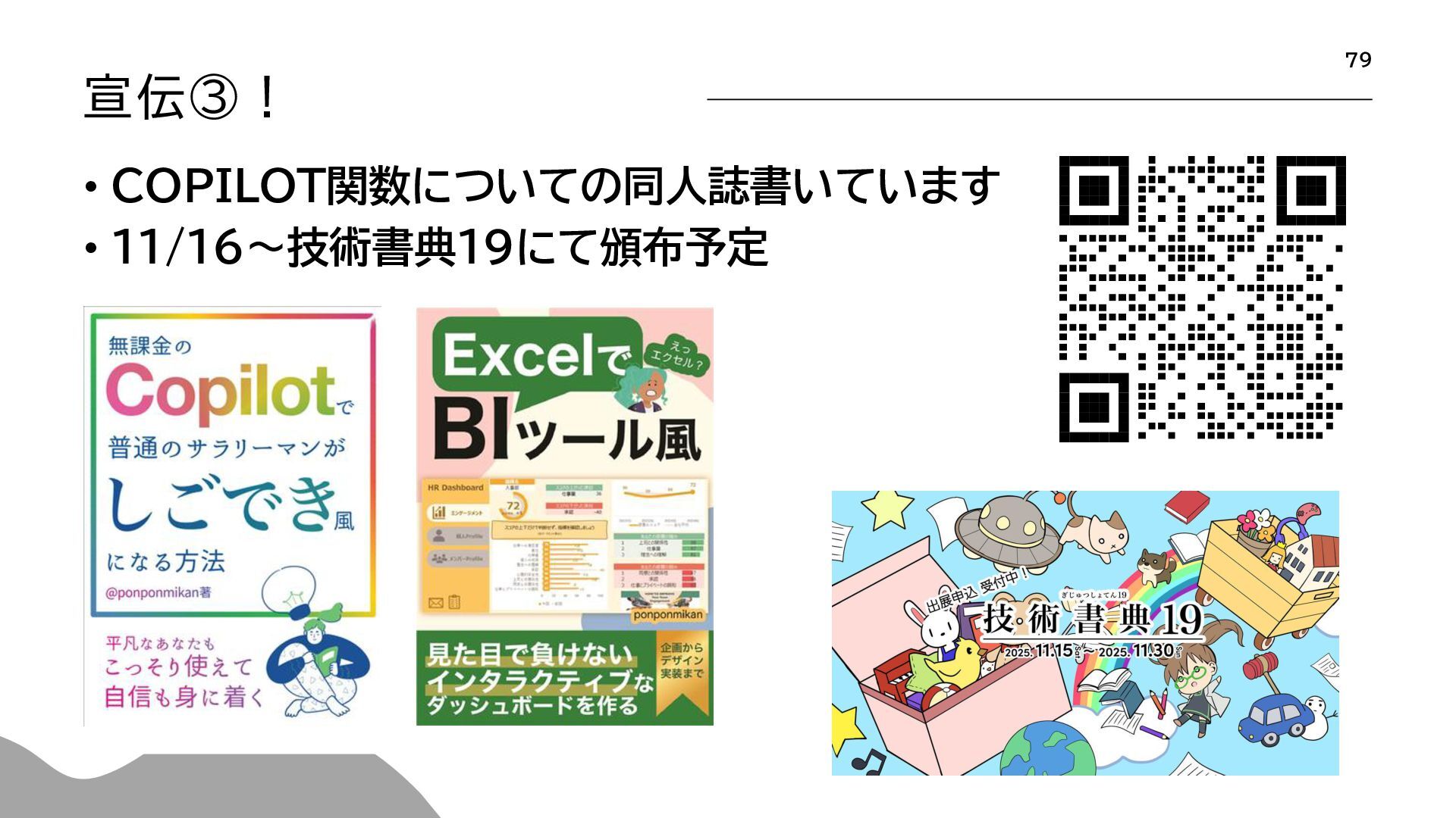 宣伝③! 79 • COPILOT関数についての同人誌書いています • 11/16~技術書典19にて頒布予定