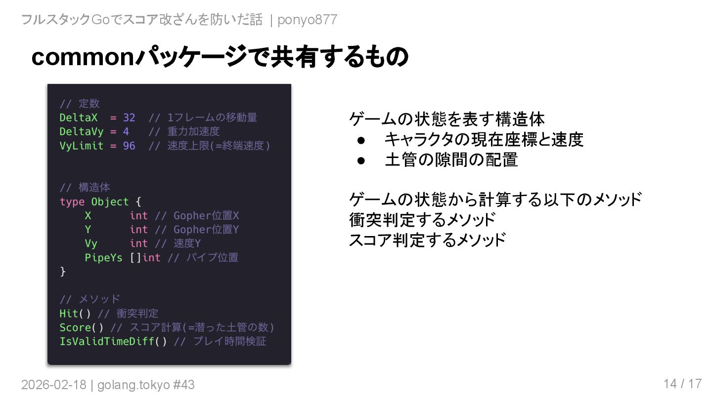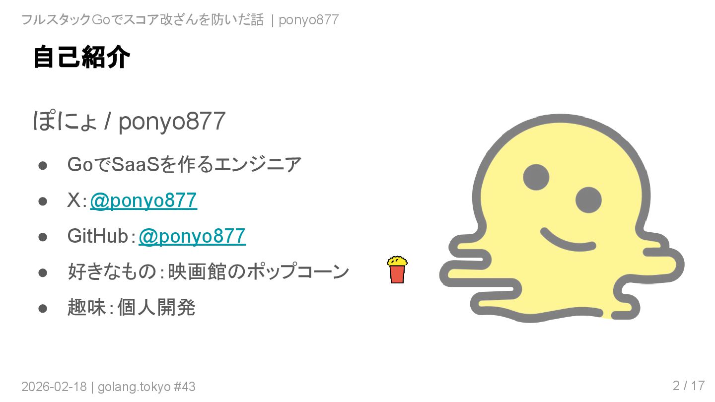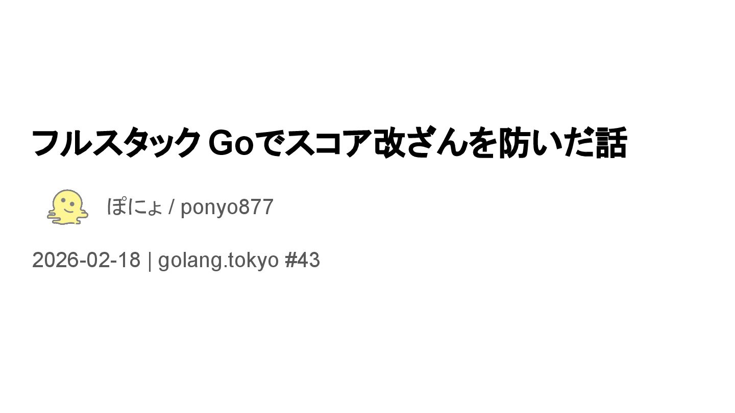 フルスタックGoでスコア改ざんを防いだ話 | ponyo877 2026-02-18 | golang.tokyo #43 2 / 17