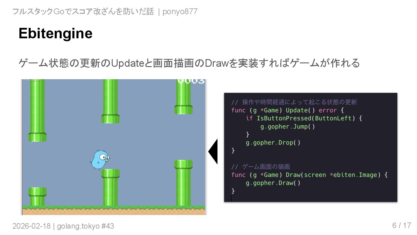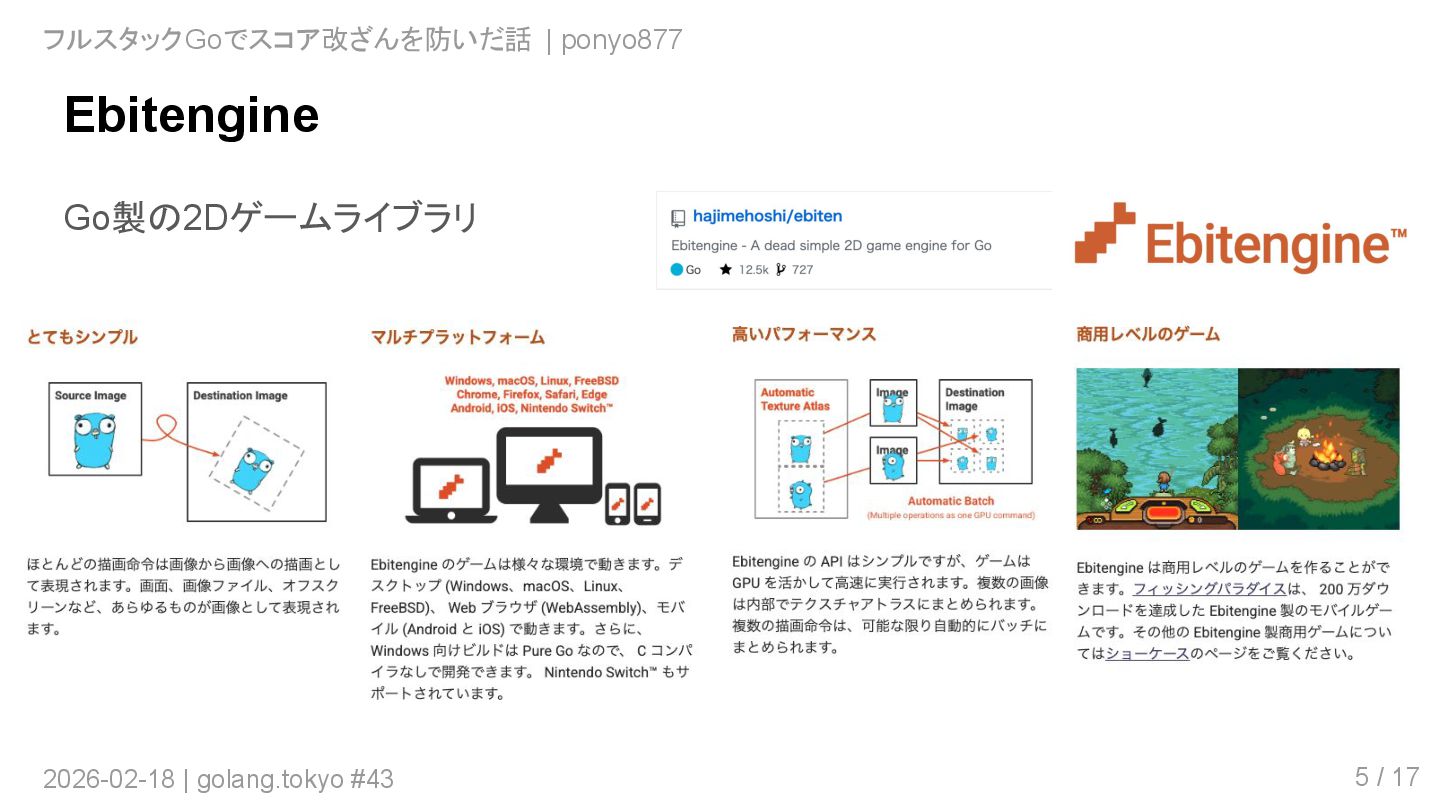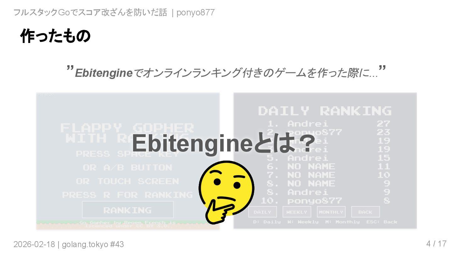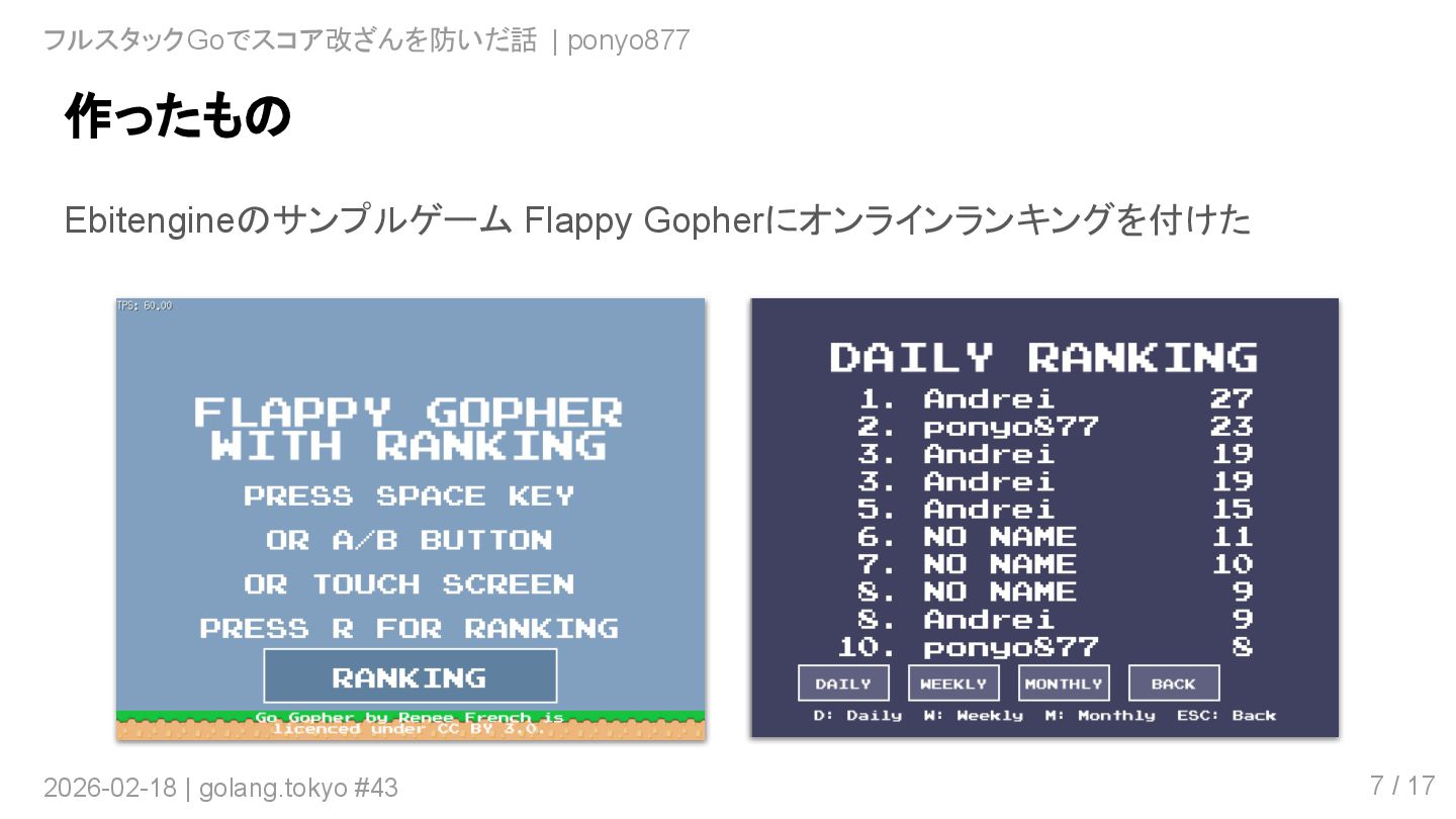 フルスタックGoでスコア改ざんを防いだ話 | ponyo877 2026-02-18 | golang.tokyo #43 2 / 17