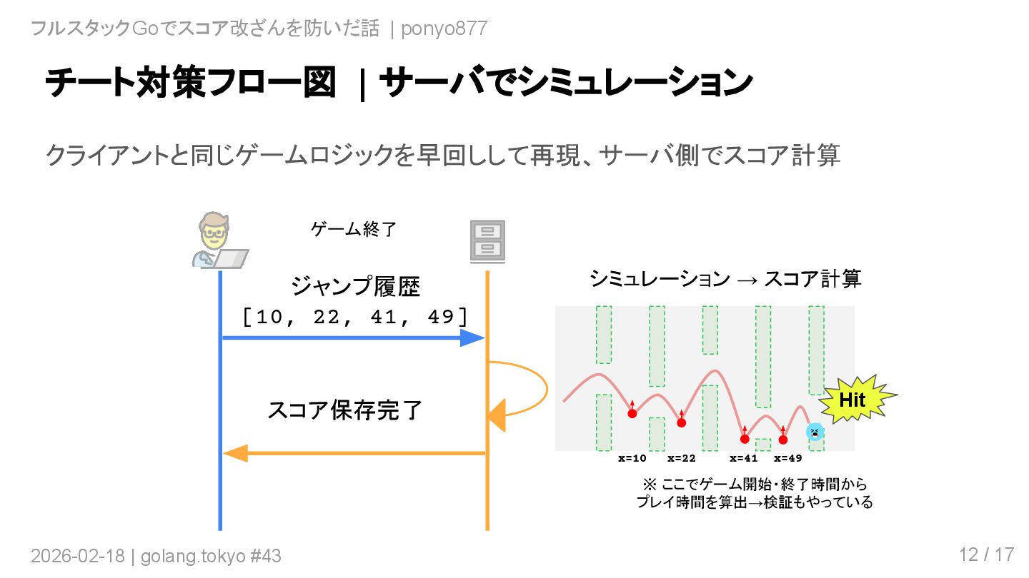 フルスタックGoでスコア改ざんを防いだ話 | ponyo877 2026-02-18 | golang.tokyo #43 12 / 17