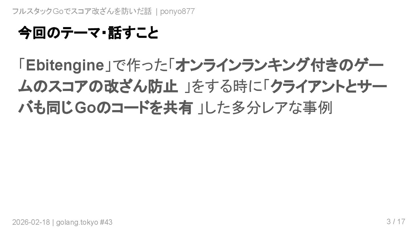 フルスタックGoでスコア改ざんを防いだ話 | ponyo877 2026-02-18 | golang.tokyo #43 3 / 17
