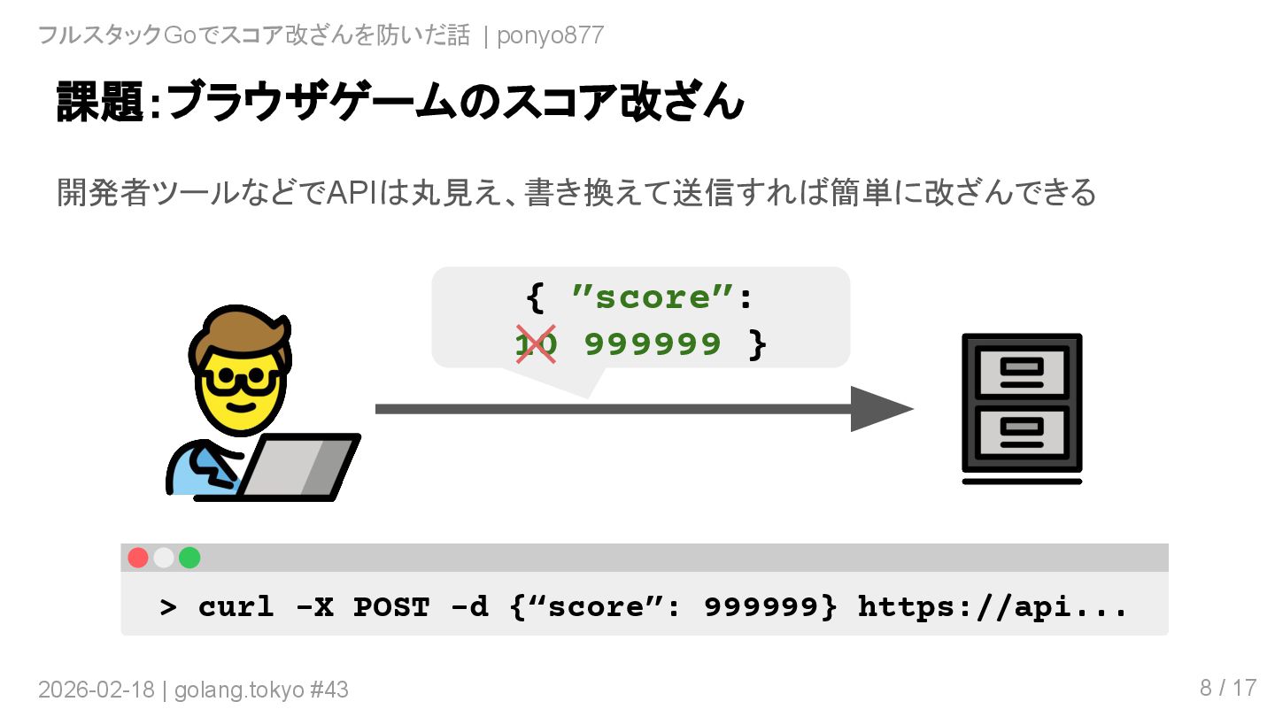 フルスタックGoでスコア改ざんを防いだ話 | ponyo877 2026-02-18 | golang.tokyo #43 8 / 17