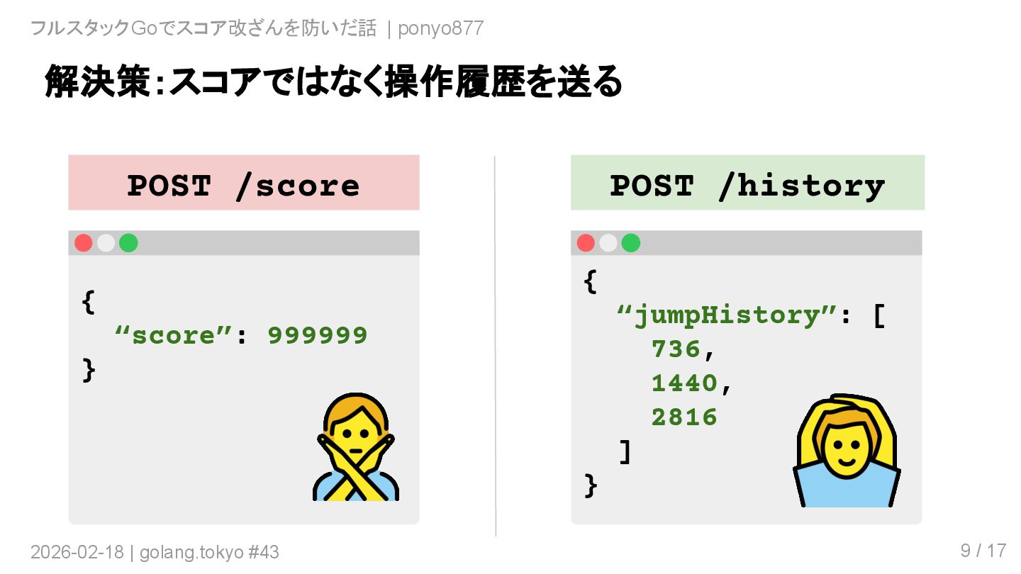 フルスタックGoでスコア改ざんを防いだ話 | ponyo877 2026-02-18 | golang.tokyo #43 9 / 17