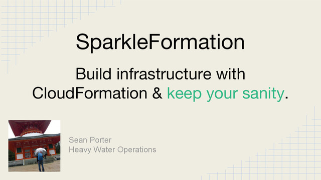 SparkleFormation is a Ruby DSL for programmatically composing CloudFormation and OpenStack Heat templates. In this talk, I will cover the DSL’s “building blocks”, provide working examples, and share neat tricks. I will demonstrate a working template, one currently being used to stress test Sensu, the open source monitoring framework (http://sensuapp.org).