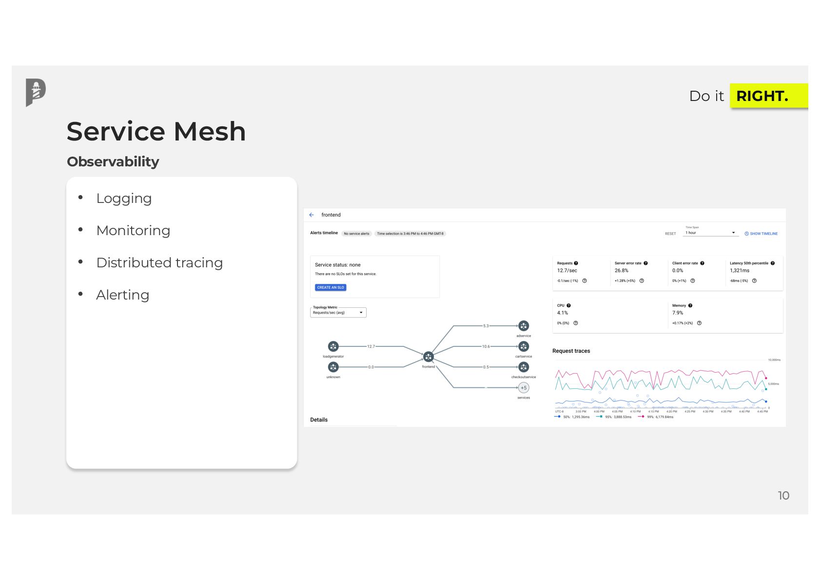 Have you ever had to set up telemetry for a bunch of microservices and found your self surrounded by metrics with no observability in sight? The GCP Service Mesh promises a “batteries included” experience for observability and security. This talk aims to challenge that – we will look at how easy it is to set up, what you get out of the box and how quickly you reach the limits. We will also compare the tool with its open-source counterpart, Istio.