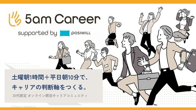 土曜朝1時間+平日朝10分で、 キャリアの判断軸をつくる。 20代限定 オンライン朝活キャリアコミュニティ © 5AM Inc. × POSIWILL Inc.