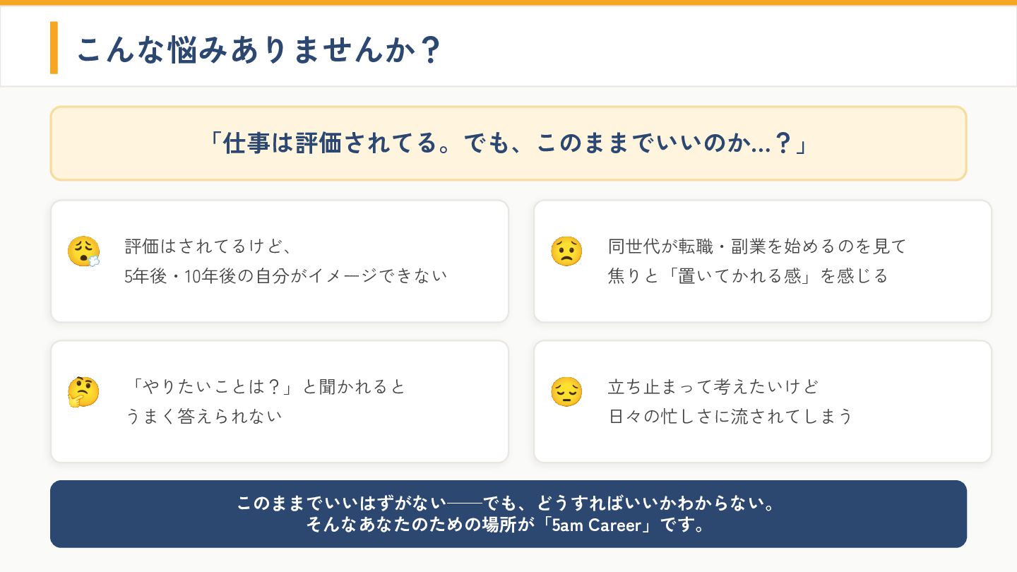 うまく答えられない 😔 立ち止まって考えたいけど 日々の忙しさに流されてしまう このままでいいはずがない──でも、どうすればいいかわからない。 そんなあなたのための場所が「5am Career」です。