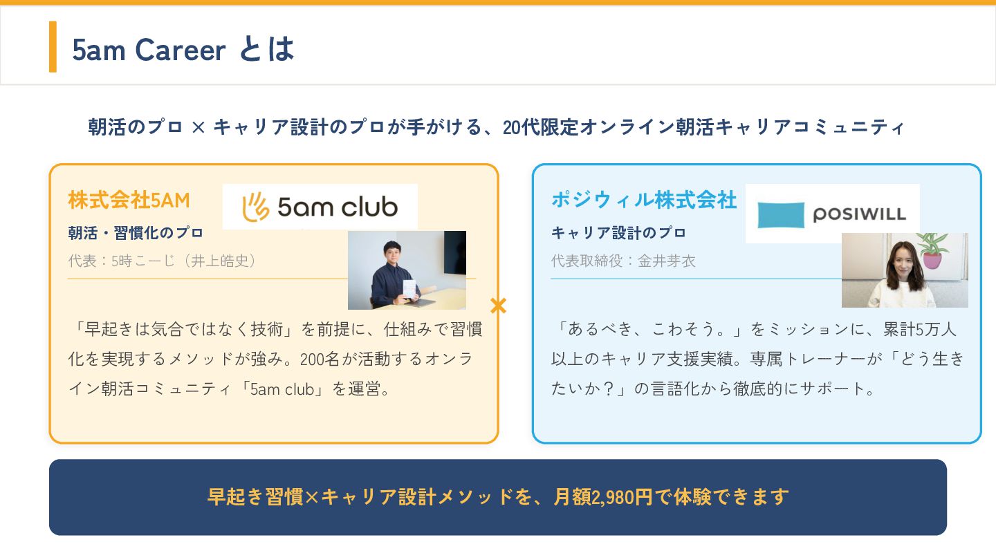 化を実現するメソッドが強み。200名が活動するオンラ イン朝活コミュニティ「5am club」を運営。 ポジウィル株式会社 キャリア設計のプロ 代表取締役:金井芽衣 「あるべき、こわそう。」をミッションに、累計5万人 以上のキャリア支援実績。専属トレーナーが「どう生き たいか?」の言語化から徹底的にサポート。 × 早起き習慣×キャリア設計メソッドを、月額2,980円で体験できます