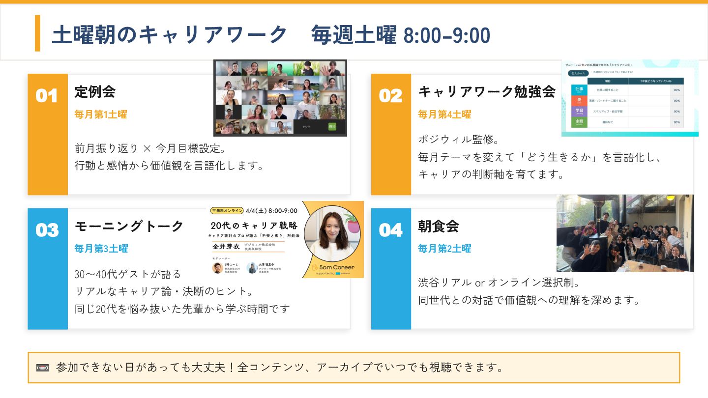 キャリアワーク勉強会 毎月第4土曜 ポジウィル監修。 毎月テーマを変えて「どう生きるか」を言語化し、 キャリアの判断軸を育てます。 03 モーニングトーク 毎月第3土曜 30〜40代ゲストが語る リアルなキャリア論・決断のヒント。 同じ20代を悩み抜いた先輩から学ぶ時間です 04 朝食会 毎月第2土曜 渋谷リアル or オンライン選択制。 同世代との対話で価値観への理解を深めます。 📼 参加できない日があっても大丈夫!全コンテンツ、アーカイブでいつでも視聴できます。