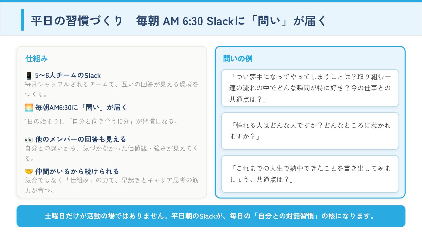 毎朝AM6:30に「問い」が届く 1日の始まりに「自分と向き合う10分」が習慣になる。 👀 他のメンバーの回答も見える 自分との違いから、気づかなかった価値観・強みが見えてく る。 🤝 仲間がいるから続けられる 気合ではなく「仕組み」の力で、早起きとキャリア思考の筋 力が育つ。 問いの例 「つい夢中になってやってしまうことは?取り組む一 連の流れの中でどんな瞬間が特に好き?今の仕事との 共通点は?」 「憧れる人はどんな人ですか?どんなところに惹かれ ますか?」 「これまでの人生で熱中できたことを書き出してみま しょう。共通点は?」 土曜日だけが活動の場ではありません。平日朝のSlackが、毎日の「自分との対話習慣」の核になります。